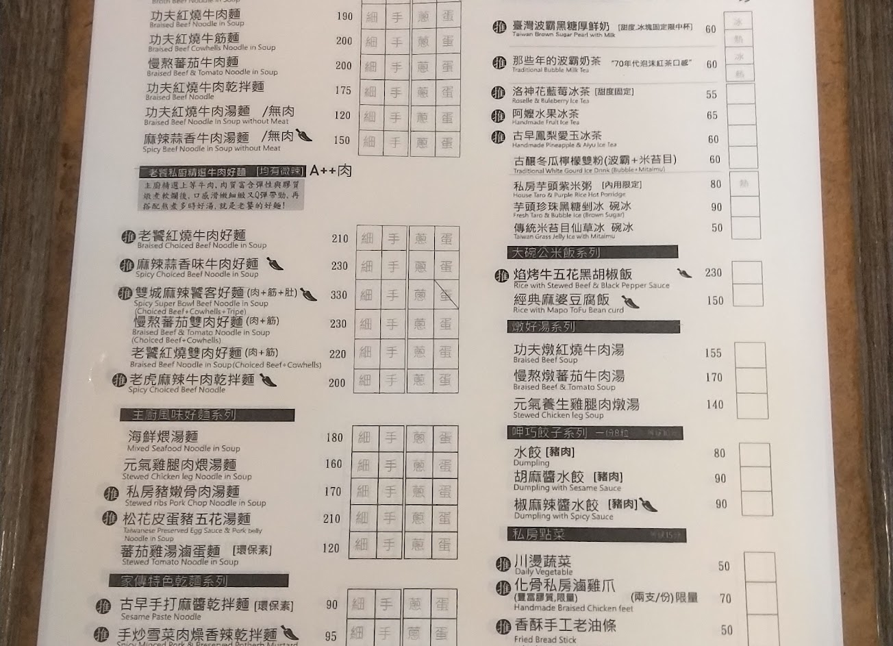 鄰近大坪林站民權路南方的熱門區塊、在狹長的二十張路小巷內,這家以牛肉麵食為標榜的台式麵店近來也成為大坪林站正餐的首選;水泥磚牆裸露和硬木桌頗有老宅懷古風味,湯匙是裝在杯子裡附上來這點也頗有點港式味道;除了菜單點的餐食之外,在櫃台旁也有滷味另供夾取,但價位也是屬於稍高。