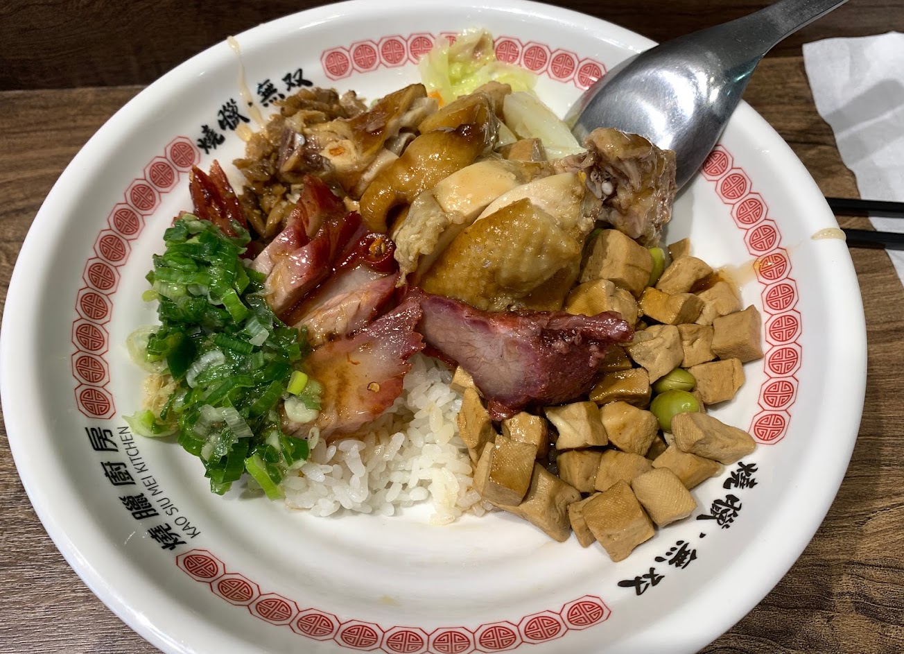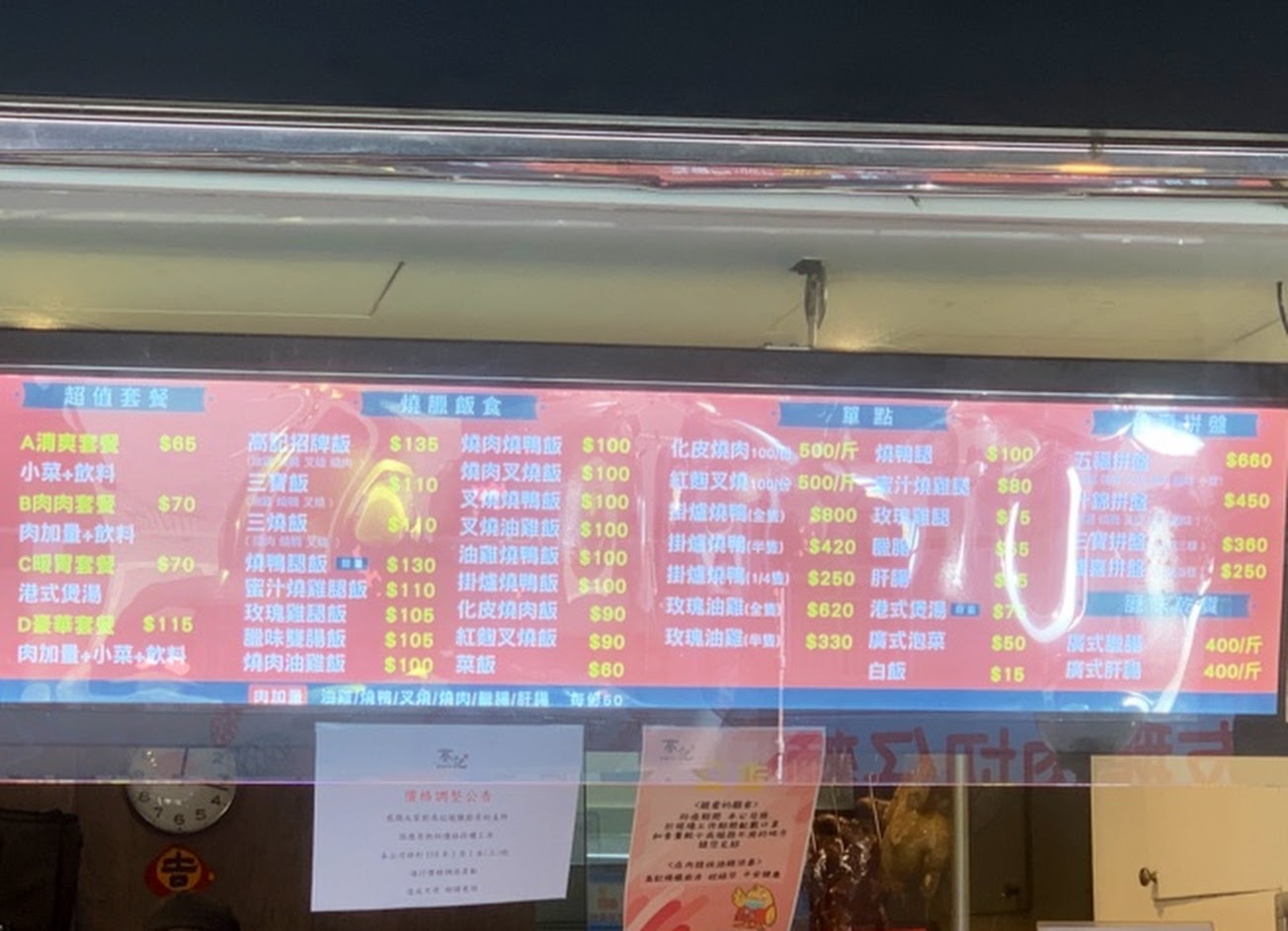 一開始以為是永康高記分店,進來才發現是燒臘店。生意好,外面排隊點餐。較一般燒臘店乾淨,可免費加飯,對食量大的人是一項福音。點了三寶,叉燒是最愛的半瘦肥,黯然銷魂!有當日煲湯是重養生的人可享受的另一項餐點。還會再回來品嚐燒肉及燒鴨,因為賣完了!