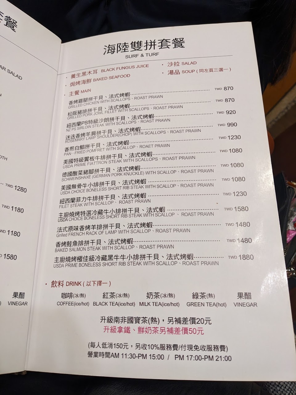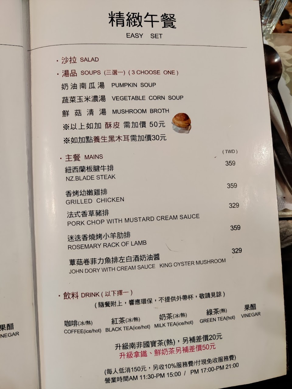 新店的老牌台式西餐廳,大概就像台北的總督跟波麗路,這次第二次來吃,老實說比第一次的糟糕體驗還要好,羊排意外的蠻好吃的,但服務生實是很糟糕,一般來說西餐端盤子應該是基本,我第一次遇過”主動”叫客人自己幫忙端到餐桌上的,人多確實比較不好放餐點,但我都讓開試圖讓好讓服務生放餐點了,結果還是叫客人幫忙端,實在無奈,然後第一道黑木耳我吃得比較慢,所以別人的吃完收走了,我還在吃,第二道沙拉接著上來,這時我吃完了,問服務生能不能收走,服務生說等一下,OK~沒問題,但過很久都沒來收,等到我沙拉吃完了,就把黑木耳的杯子放在等待收走的沙拉盤上,沒想到服務生收盤子時,把那空杯子放回餐桌上,再把盤子收走,好~~~~就算你要收多個盤子,讓你多疊個小杯子有困難好惹,那你送完盤子後總該回來收杯子吧…結果也沒有,之後我把那杯子丟到空位子上的桌子,才有人把它收走…要不是礙於是公司聚餐,我不好發作~不然平常我一定會表達我的不滿,這種平價餐廳,我不要求服務要多好,但基本的俐落總要有吧…