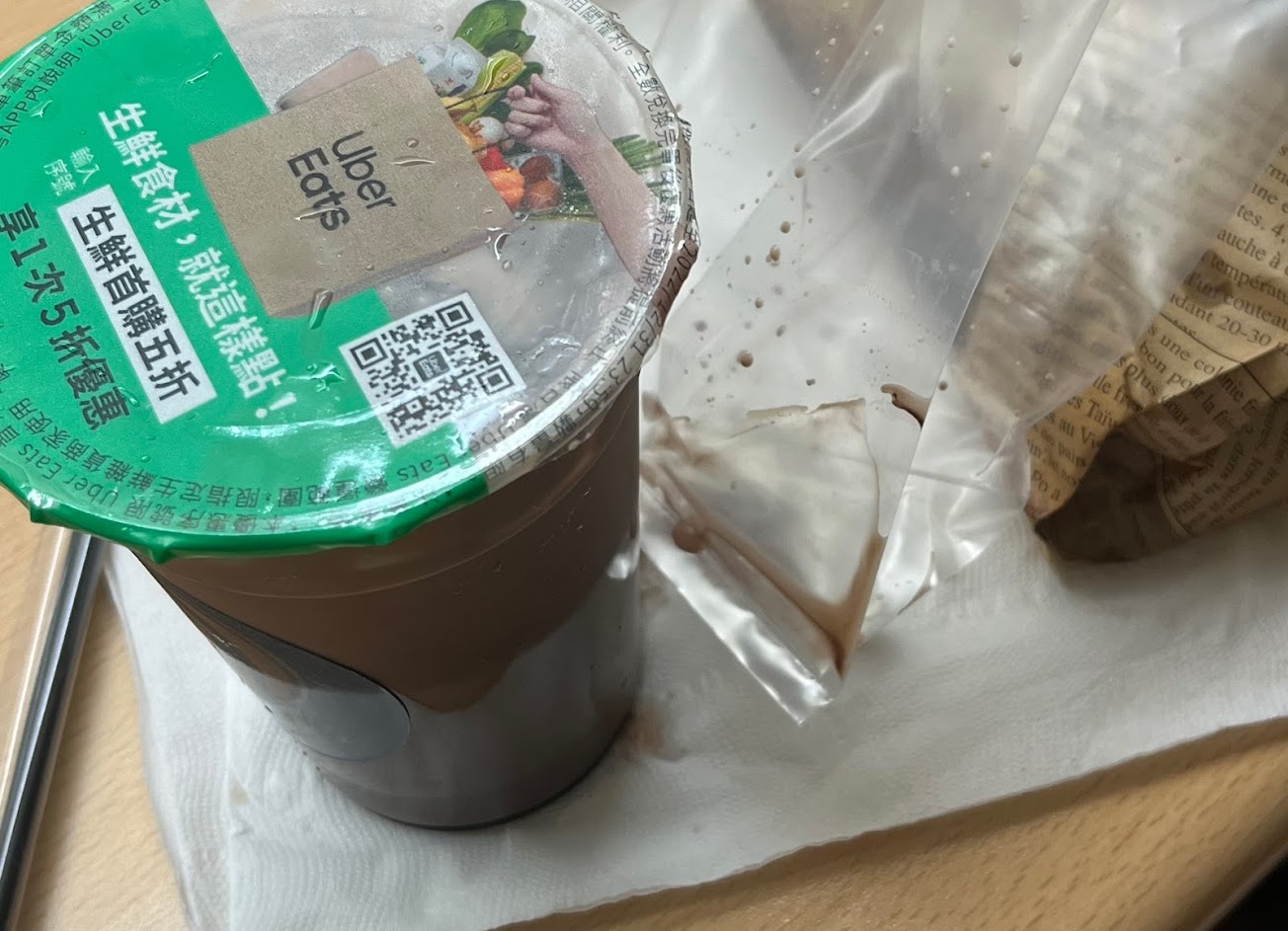 飲料封膜沒封好,都灑出來了