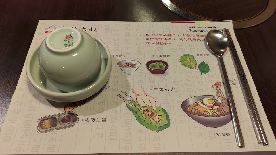 「首爾大叔」是在新店地區(小碧潭)頗可以推薦的漢式餐廳,我們經常來享用,有時候是一般的午餐,今天是家庭聚餐。今天點的是四人套餐-烤肉(牛小排、松阪豬、豬五花)、高麗菜海鮮煎餅、BBQ炸雞及蔘雞湯,七樣韓式小菜持續供應。老闆桌邊服務,使用水晶烤盤烤肉,食物的品質與份量都令人滿意。