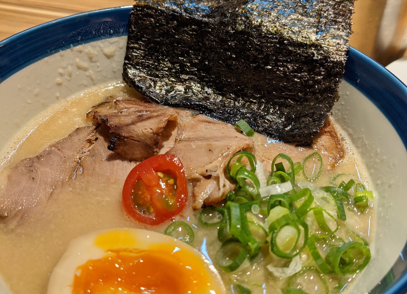 一家空間寬敞、價格平實但毫不馬虎的豚骨拉麵,比起坊間各種浮誇昂貴的噱頭拉麵,這家拉麵口味不多(應該說只有一種)但每一個環節都做的很到位,麵條有嚼勁不軟爛、湯頭濃郁不膩、叉燒偏瘦但不柴,還有一股炙烤的香味。加的東西不多但很和諧,海苔片、蔥花、溏心蛋跟一顆小顆番茄都默默做到自己畫龍點睛但不搶戲的本分。是一碗樸實無華但無懈可擊的拉麵,吃到後面加一兩片檸檬下去喝完湯真的是幸福人生。