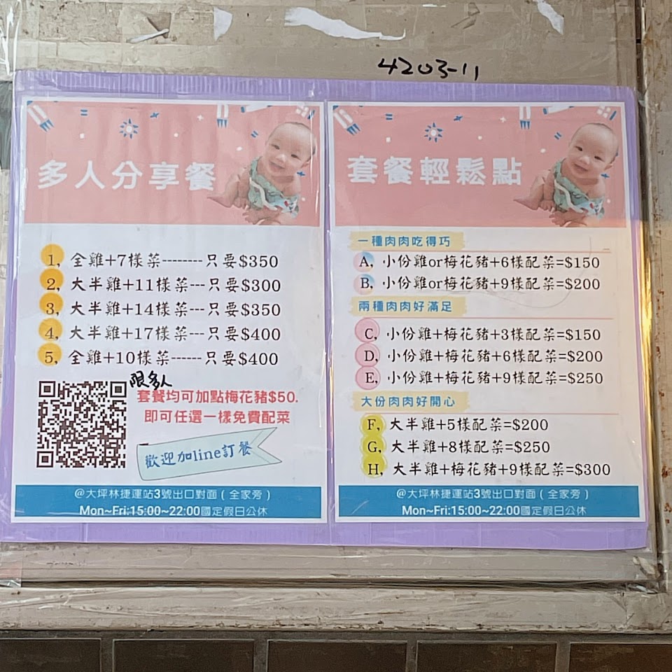 從捷運站出來必經過之路,其實菜色非常多,還有很方便的line pay跟台灣pay,初次體驗購買回家吃之後覺得太鹹,所以前幾天購買半隻雞+10樣菜,共300元,有跟老闆說要半鹹,但回家吃後還發現太鹹,下次應該會說一點鹹跟一點香油就好,但老闆人很好,每次購買都會多送菜,整體cp值很高,但就是不要太鹹就好。