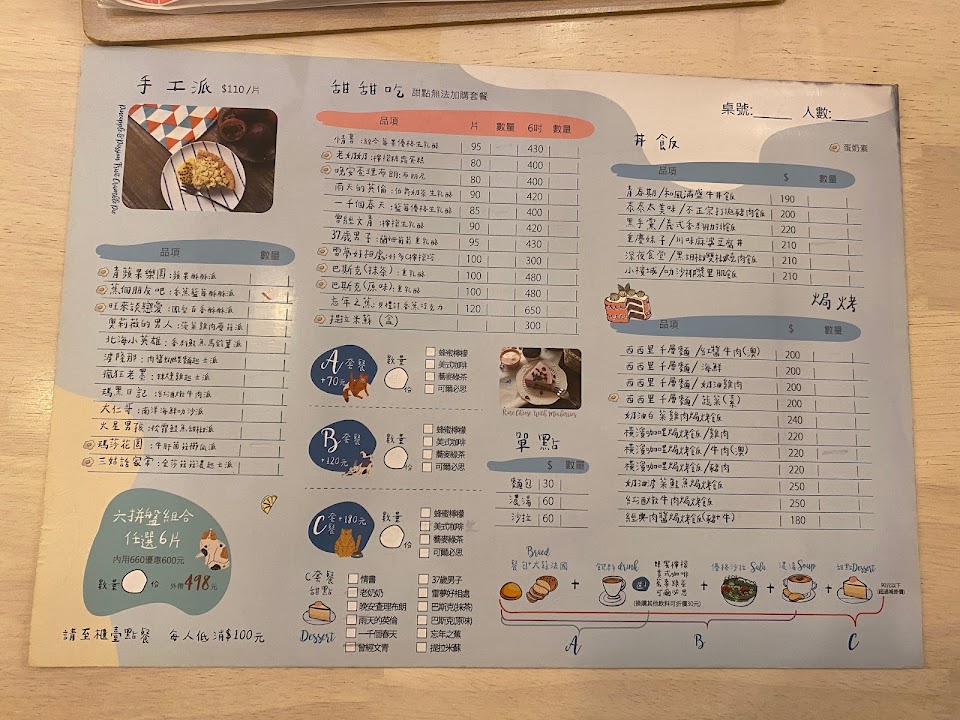 東西還不錯,只是不能當正餐,男生一定吃不飽,但假如單純以點心的定位來說,鹹派類還不錯,茶包用的算高檔,所以茶類喝起來比一些飲料店的好喝。唯一美中不足的是店面較為矮小,附近有公車站,但是沒法停汽車,除非你在店門口紅線偷停,不然他剛好在七張與新店市公所兩個捷運站中間,比較不方便,建議騎車去!另外它套餐類的甜派比正常版本小一半有吧!個人覺得吃起來會不太過癮,會想要多一點,份量會是這間店的罩門,畢竟美式派吃多了,就會對於派必須是大又豪邁產生既定印象,比較可惜。