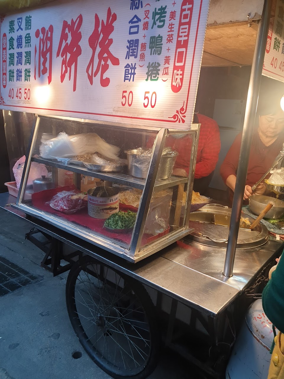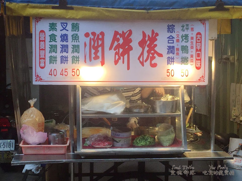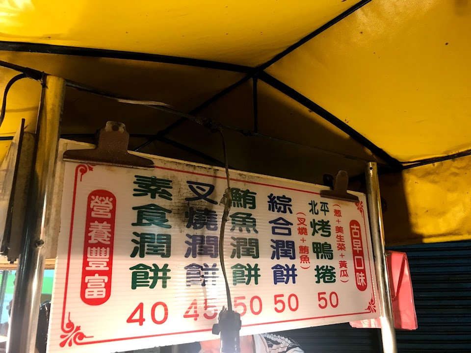 薄而帶著麵香的餅皮, 內餡溼軟入味, 有高麗菜, 豆芽菜, 花生粉, 豆干碎, 小黃瓜, 叉燒肉或鮪魚, 味覺相當豐富, 用料實在, 口感紮實又美味;阿伯賣很久了, 從小吃到大的忠實顧客不少, 50元銅板ㄧ枚, 飽食之餘, 還有滿滿的憶舊情懷。