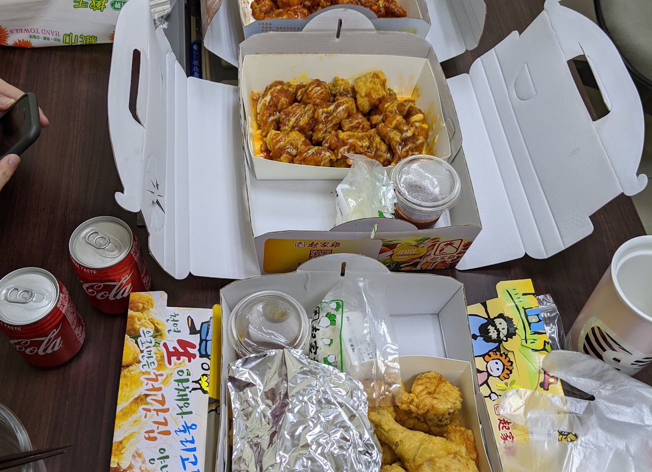 電話點餐指定時間去拿才不用等很久;原味炸雞酥脆多汁、招牌洋釀的醬和想像的不太一樣,原本以為會像在韓國吃到的甜甜的炸雞類似,但是也不錯,肉比原味乾一點點;炸年糕微微辣,還可以接受,但是口感不是個人喜歡的。取餐可以刷卡還蠻方便的喔!