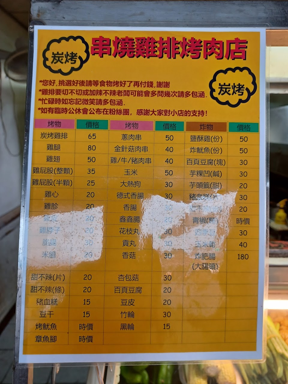 以下碳烤的雞排、蔥肉串、牛肉串、大熱狗、貢丸、甜不辣、豆干、豆皮