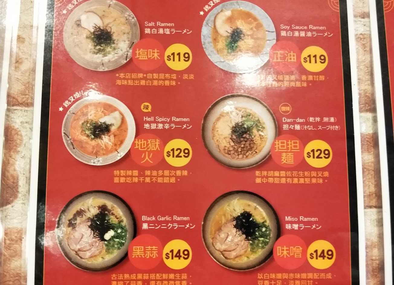 很台味啊 點了地獄火豪華版 整個人都?了 吃到碗底才感覺到辣(辣醬沒散吧) 叉燒竟然是雞胸肉片(嚇到我昏厥)(心裡出現皮諾可真不敢相信的畫面) 麵條普普大概有60分啦 (還好不是陽春麵條) 湯頭也平庸 蛋還不錯