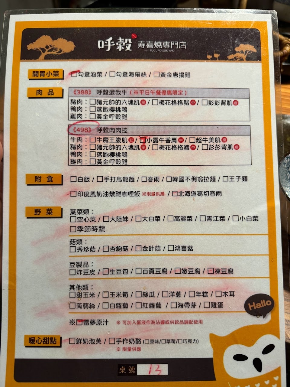 2024最新在地推薦餐廳的菜單_呼穀壽喜燒|貓頭鷹主題吃到飽餐廳|Fuguro Sukiyaki的菜單、圖片