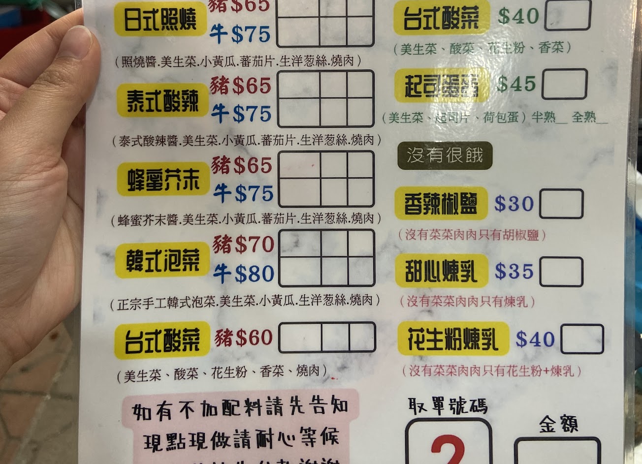 買了日式照燒、泰式酸辣、蜂蜜芥末、韓式泡菜、台式酸菜給自己及家人吃,家人說每個口味都很好吃且料多紮實,尤其是日式照燒,大獲好評!?
