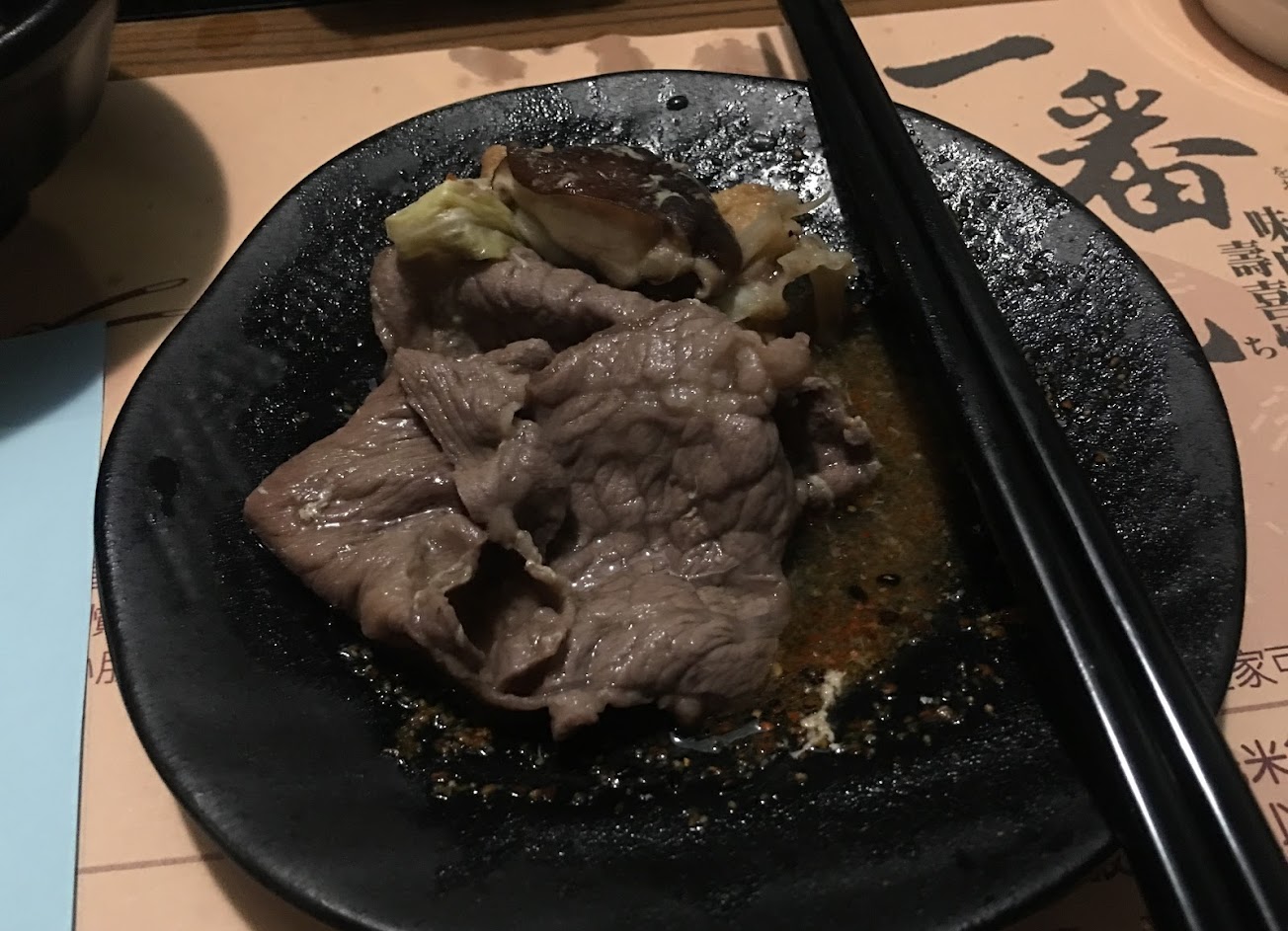 1.口味:肉質普通,菜車選擇還算多元,醬油本身淡而無味,吃起來感覺像是加了很多水的柴魚醬油。我個人非常喜歡吃壽喜燒,但單從口味來看,我覺得一番地頗不道地。
