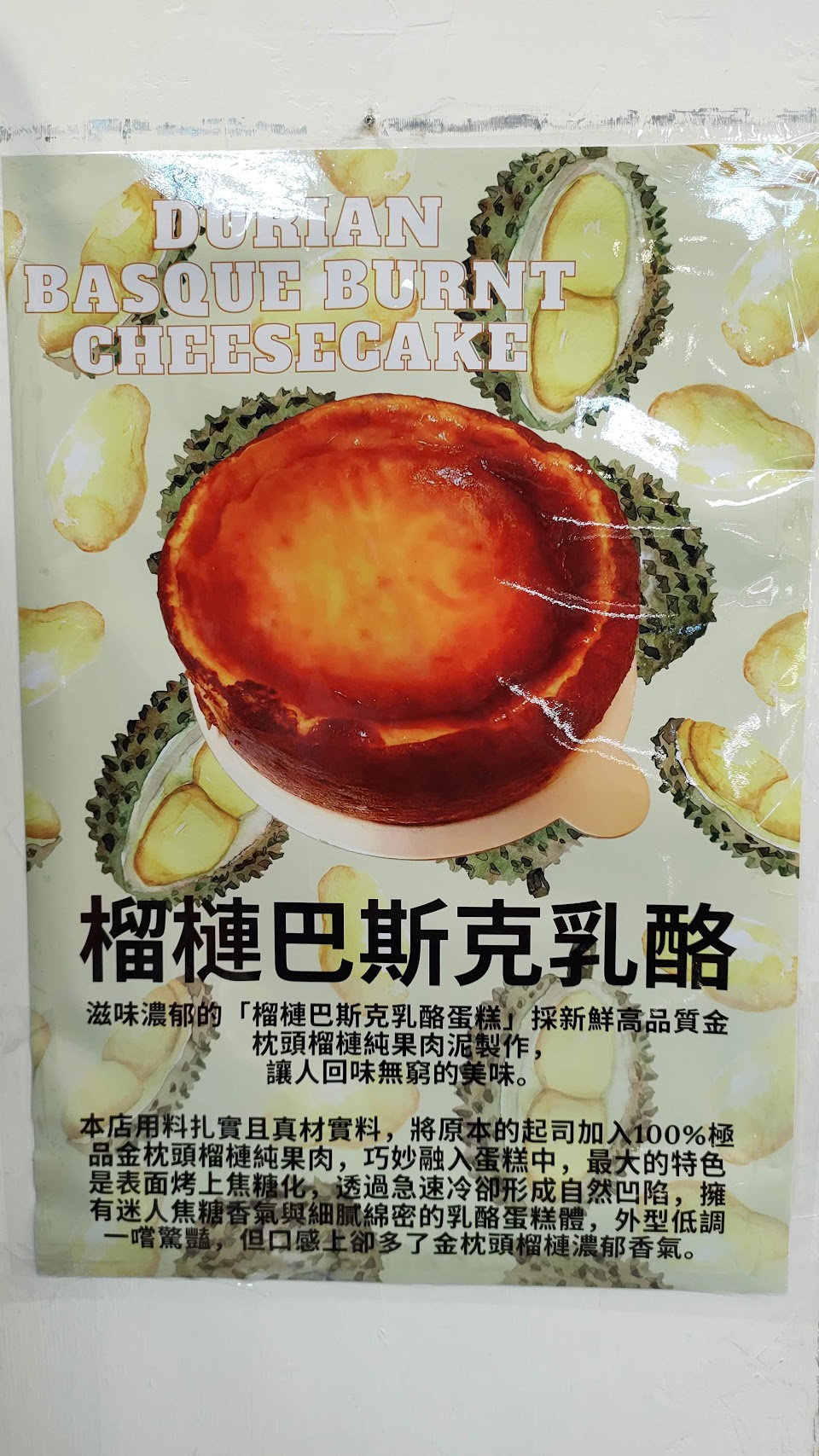 門面的榴槤起司海報很吸睛,對於愛吃榴槤的人,就像有磁性般的吸引進來,進門就看見手工小餅乾、傳統的桂圓蛋糕、各式麵包、土司排滿了兩面牆,大冰櫃裡排放著各種不同口味及造型的蛋糕,小冰櫃裡有泡芙和門口海報上的榴槤起司奶酪,選擇困難的人將會出不了門!