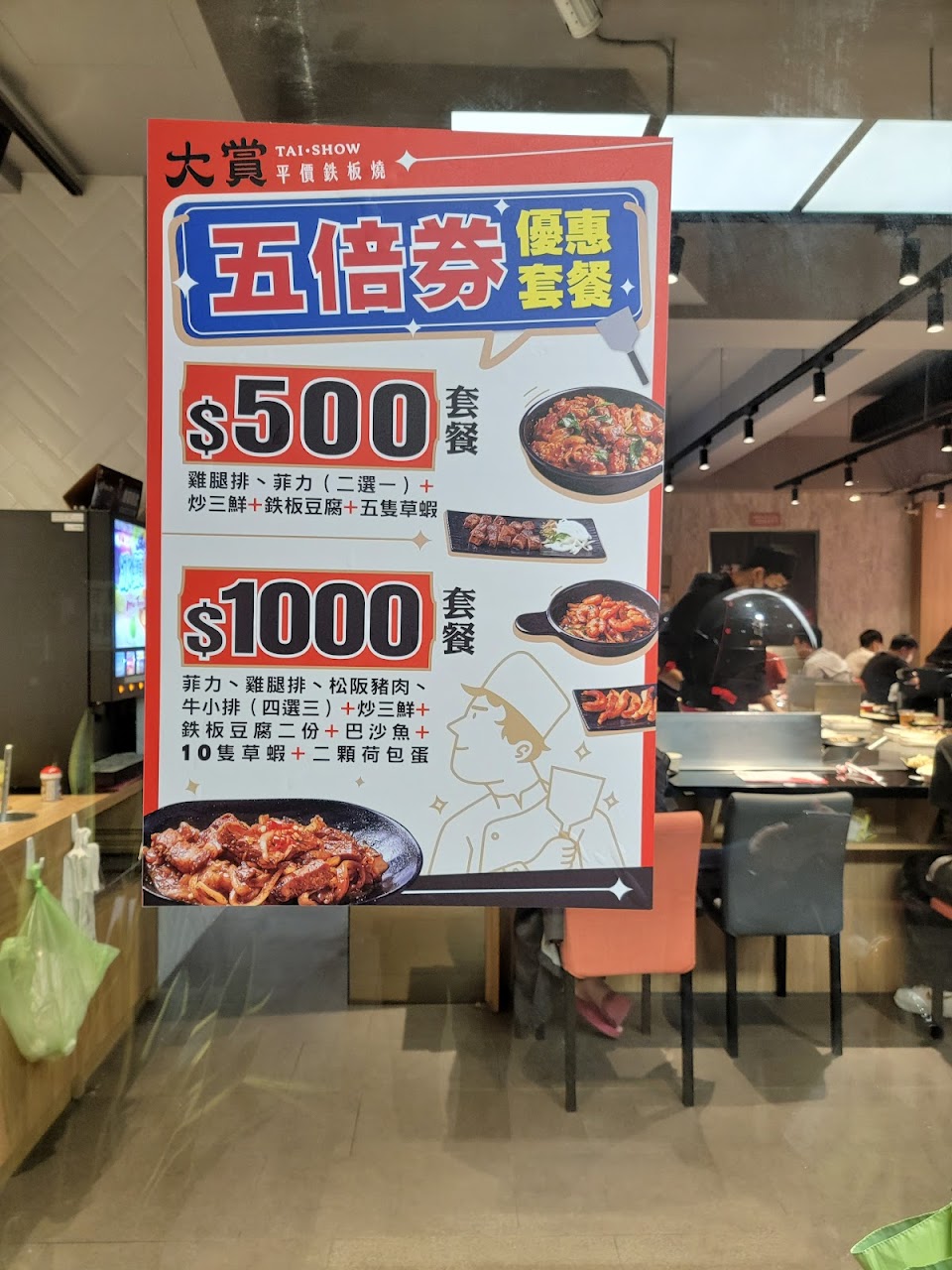 套餐很划算,員工親切,會主動關心用餐狀況,但鐵板燒還是要有鐵板保溫才好吃,放盤子降溫太快,尤其是牛肉,冷了就不好吃了,這樣圍坐在吧枱很多餘,還不如坐桌位區,不會弄得滿身油煙,最好吃的推草蝦,配上炒蒜末有加分喲!