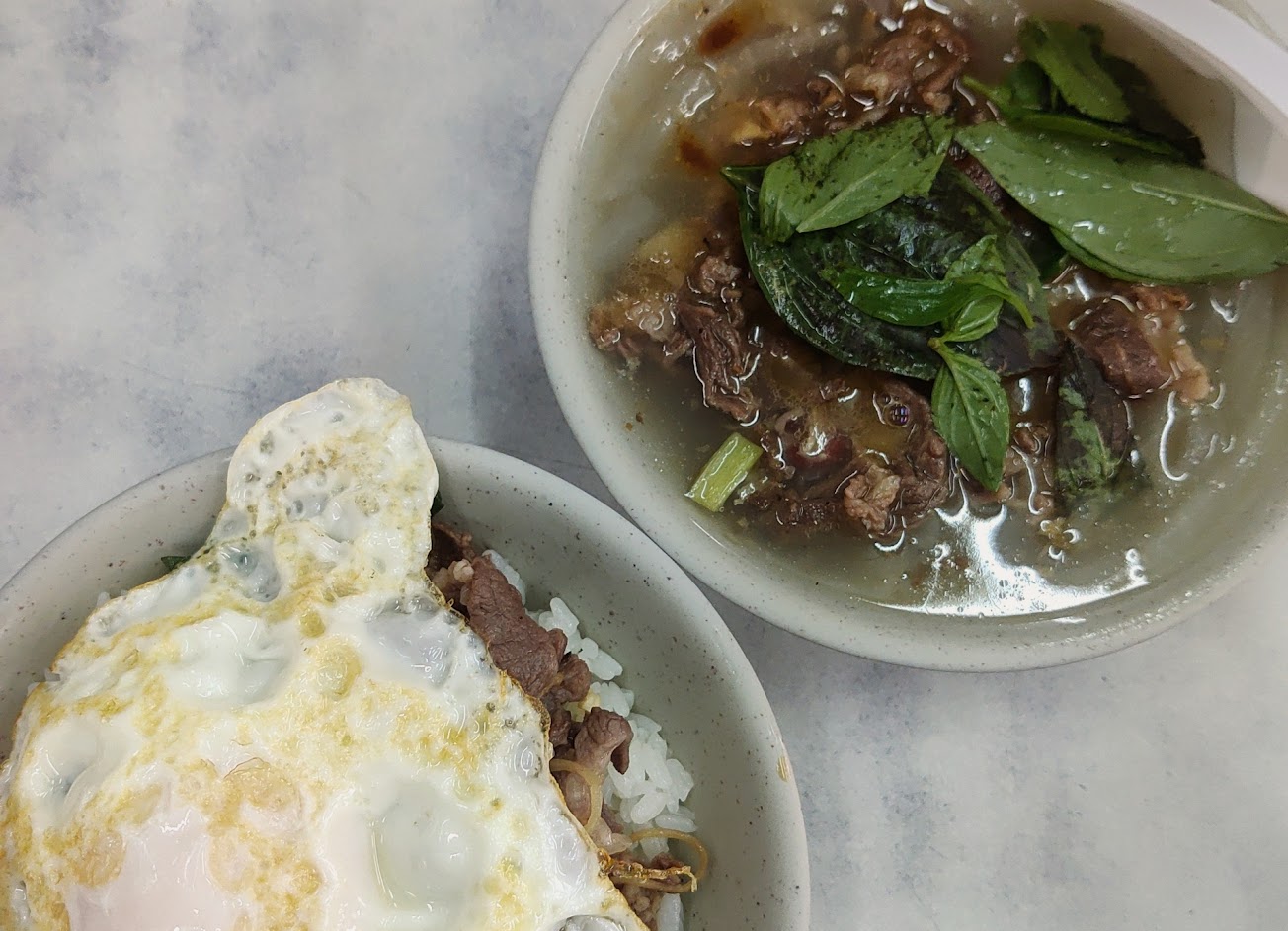 出餐快速,還沒選定座位,餐就先到了!非現炒羊肉蓋飯搭配荷包蛋半熟蛋黃的濃汁,肉沫和飯濕潤不乾柴,有一種吃「學生飯」的感覺。餐桌上有蒜味醬油和九層塔自由取用,雖然只能生搭九層塔配著吃,稍微滿足九層塔控的味蕾。(相信羊肉羹應該會符合我的最愛……準備再跑第二趟)