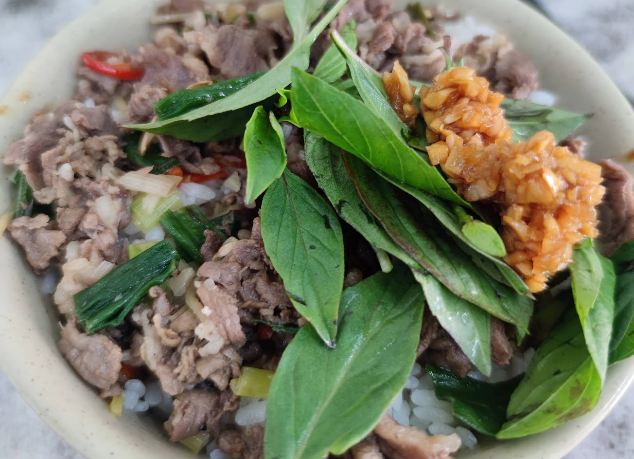 羊肉雖不是現點現炒,不過,吃起來很是有沙茶和鑊氣的香味,相當下飯。另外,這裡最受歡迎的配角就是店家自製的蒜辣醬,滿滿的蒜頭搭配辣椒醬油,整罐的蒜頭自由取用,根本是嗜蒜者的天堂,除此以外,還有九層塔也是免費提供,搭配羊肉羹或羊肉飯都很對味。