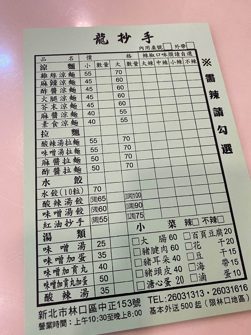 餐點好吃,特別是涼麵,可選辣度,相當夠勁,水餃、綜合湯也不錯,用餐時間人潮較多,店內座位不是很多,常客滿,出餐速度算快,外帶不會等很久,推薦給來林口舊街的人。
