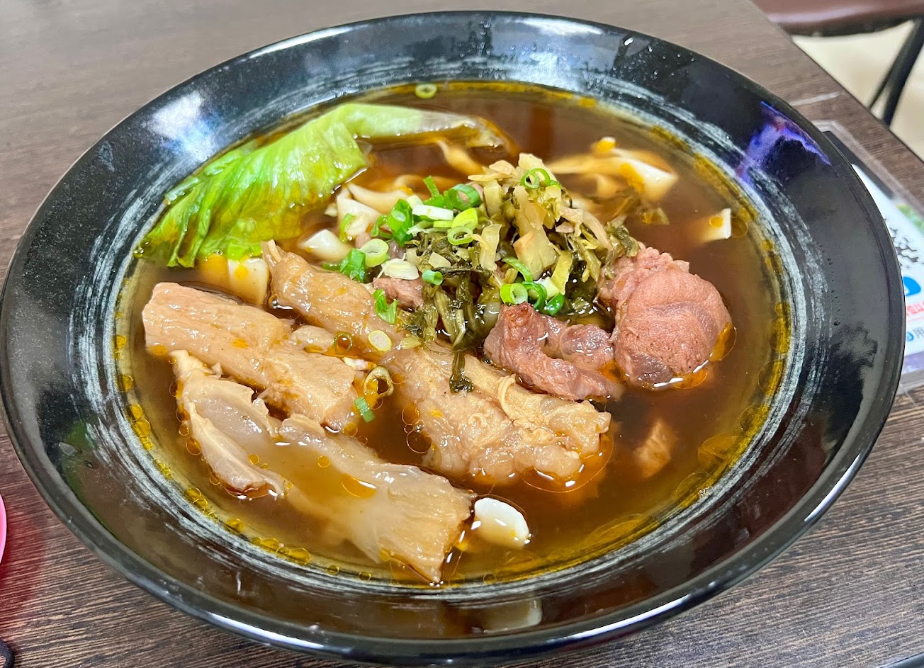 紅燒湯頭,半斤半肉都很到位!試了細麵,Q彈。滷花生也很好吃。林口三井牛肉麵首選。推!