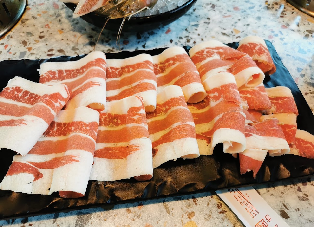 食材品質中下,第一次看到這麼油的牛雪花?明蝦也很不新鮮,不知道為什麼評價這麼高? …