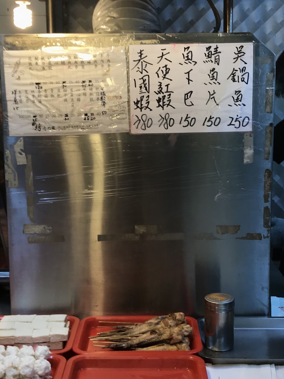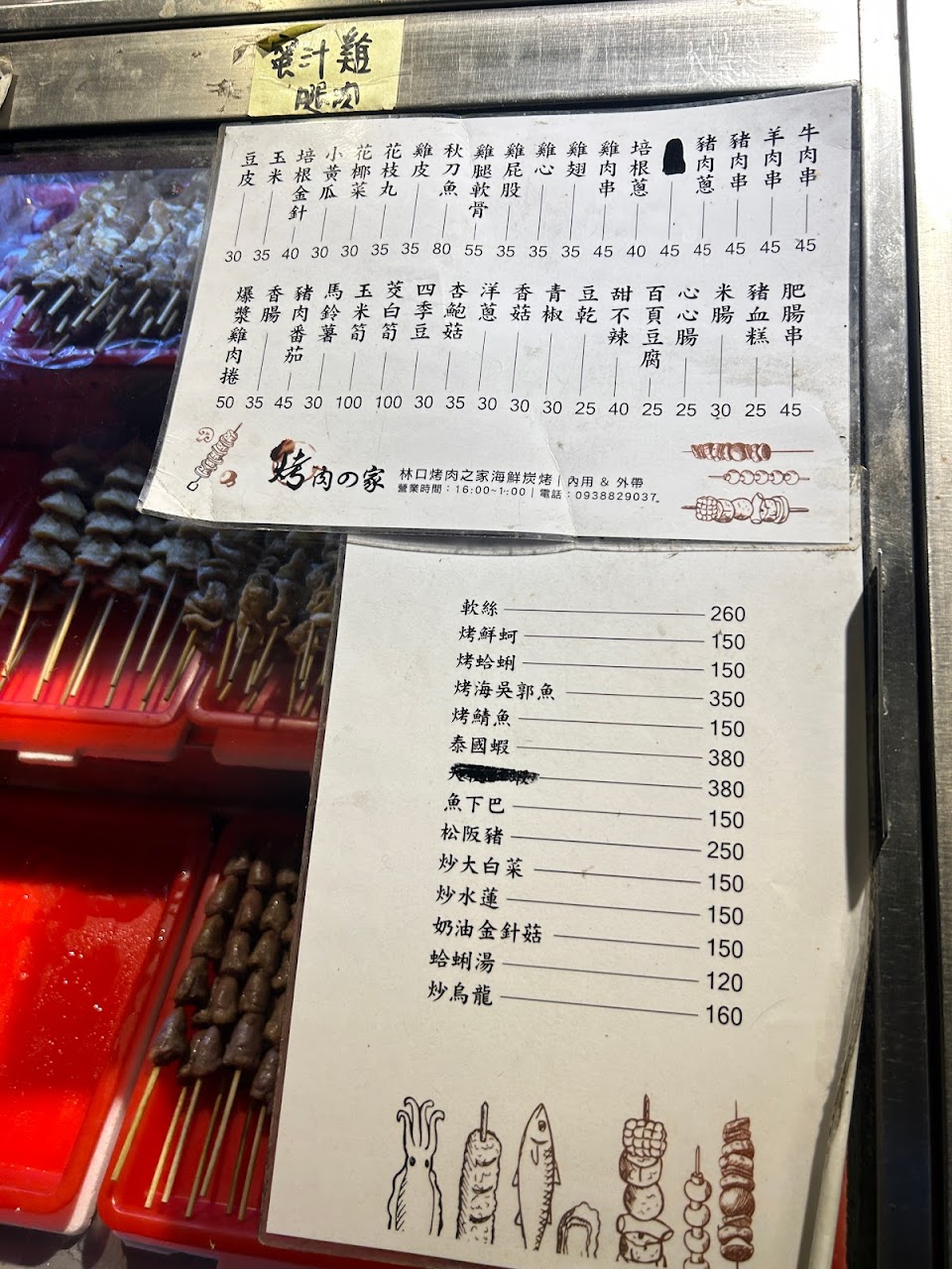 他們的燒烤種類眾多,有牛,羊,雞肉串類,也有包蔥的肉串,雞翅,雞皮,雞屁屁、海鮮也有秋刀魚、蔬菜類的玉米,四季豆,花椰菜,地瓜,杏鮑菇都有。基本上來這邊都會點個肉串、甜不辣、豆皮、豬血糕、百頁豆腐、花椰菜,豆皮,米血這些家庭常備款,價位也比較親民,若是揪朋友喝個小酒,烤魚、烤蝦也可以來一盤。