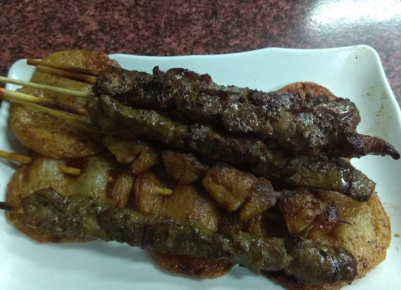 肉串都有調味過,但是烤起來都稍微乾了一些。米血軟Q,洋蔥、青椒還算水潤,再烤久一點會更香。價格偏貴。