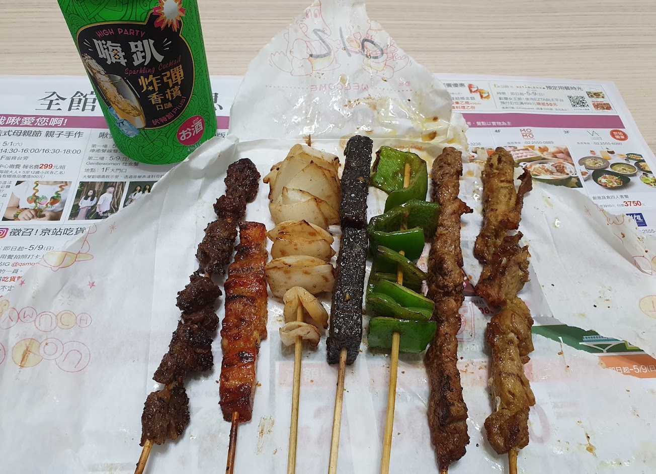 《黑胡椒牛肉串、蜜汁豬肉串、洋蔥、米血、青椒、山豬肉串、咖哩雞肉串》(由左到右)