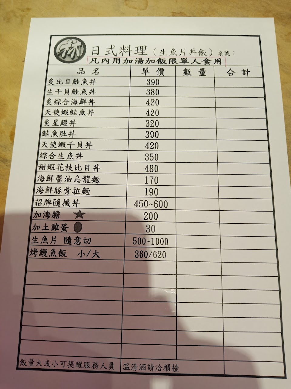 1.隨機丼500$ 如照片,價位、份量可能跟台北市差不多(?),湯可續、飯可續。(隨機丼最便宜450$)