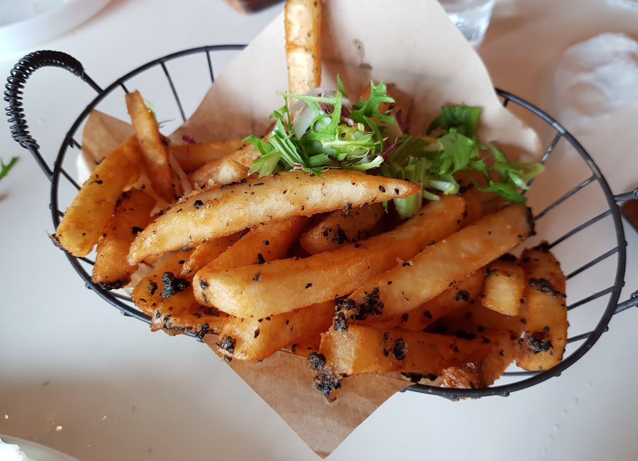 晚餐點了鴨肉,肉質還可以,提味的橘色一撮忘了什麼,味道沒出來,牛肉,一樣提味的佐料也太淡,肉7分熟還可以,魚ok,松露薯條也是該用鹽提味較好,烤蔬菜也還ok.如果有大塊的杏鮑菇口感會更好,整體上調味的佐料都偏淡。甜點焦糖起司可以,我點了麵茶咖啡還不錯,不過這適合早餐。