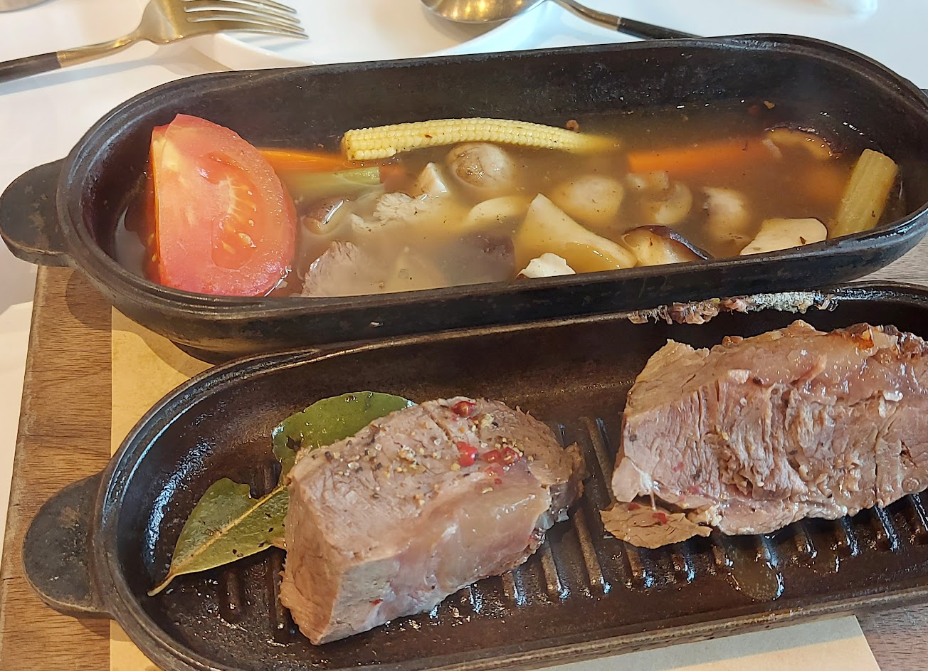 #荷蘭鍋慢燉牛肉:一開始服務生打開那小小的鍋蓋後,協助將牛肉撈至鍋蓋,但這牛肉吃了之後會顛覆燉牛肉的印象,燉的很嫩,以牛肉來說已達到「入口即化」的地步!這是我會想再點來吃的一道菜,另外燉煮的湯味道也屬清淡且充滿濃厚的食材香味…