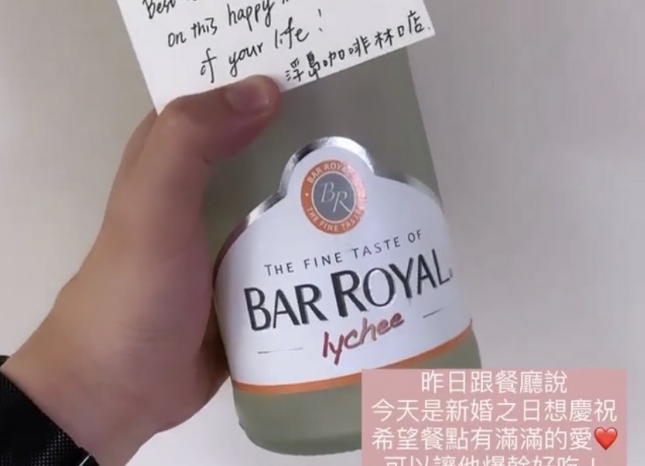 此次訂購主要是因為6月17號與夫人辦理結婚登記,因為疫情關係無法外出,所以想給她一個驚喜,而我也將此點備註在訂單上,沒想到隔天至餐廳取餐時,意外收到來自老闆娘贈送的荔枝甜酒及餐廳所有人的祝福!