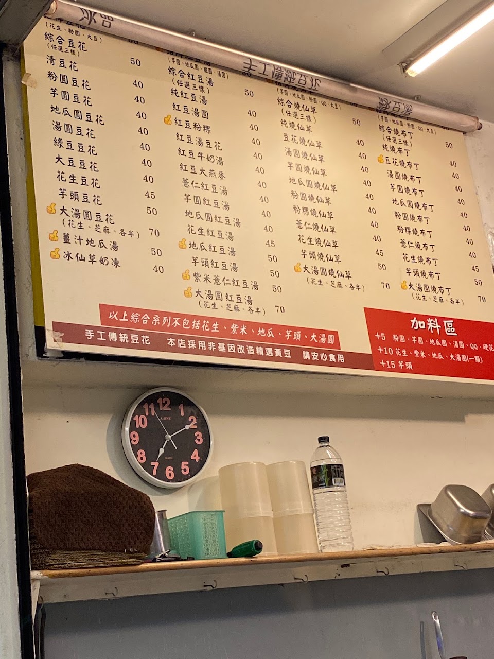 應該先看評論再買的,買了5碗綜合豆花可以加3樣料,選花生一碗加5塊,