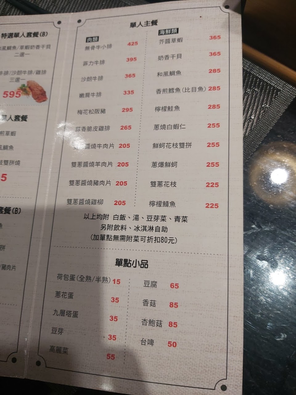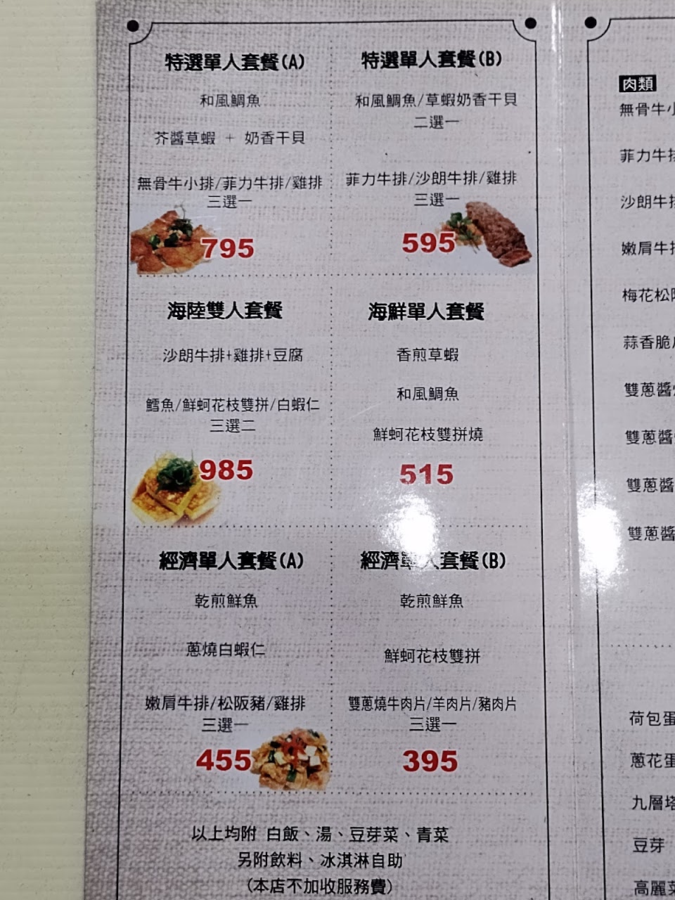 包含沙朗牛排、雞排、豆腐,海鮮部分則是「鱈魚/鮮蚵花枝雙拼/白蝦仁」三選二,我們選了鱈魚跟鮮蚵花枝雙拼。