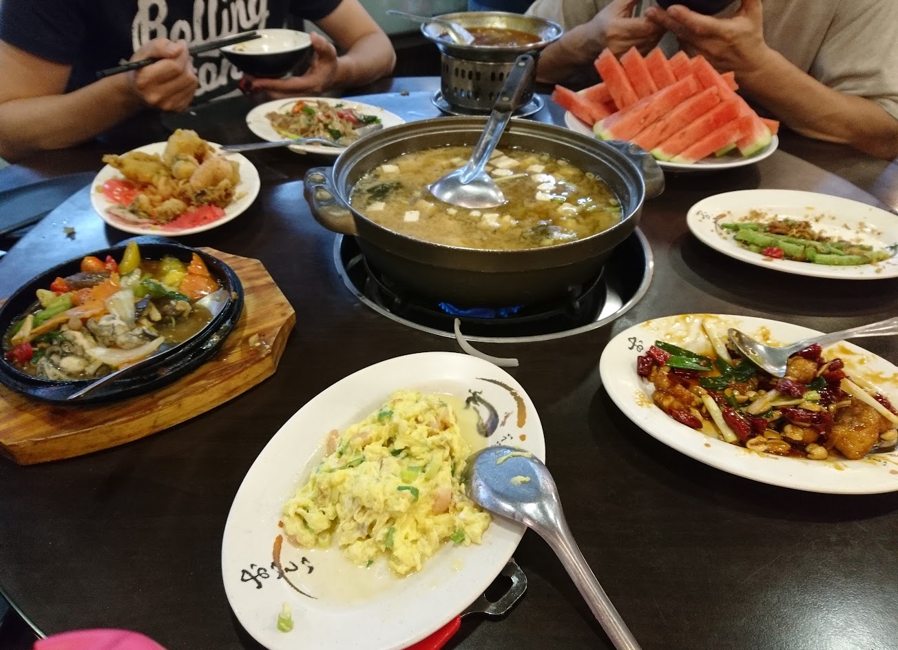 夭壽好吃,麻油川七松阪,金沙蝦球,培根高麗菜,酸菜肚片湯。