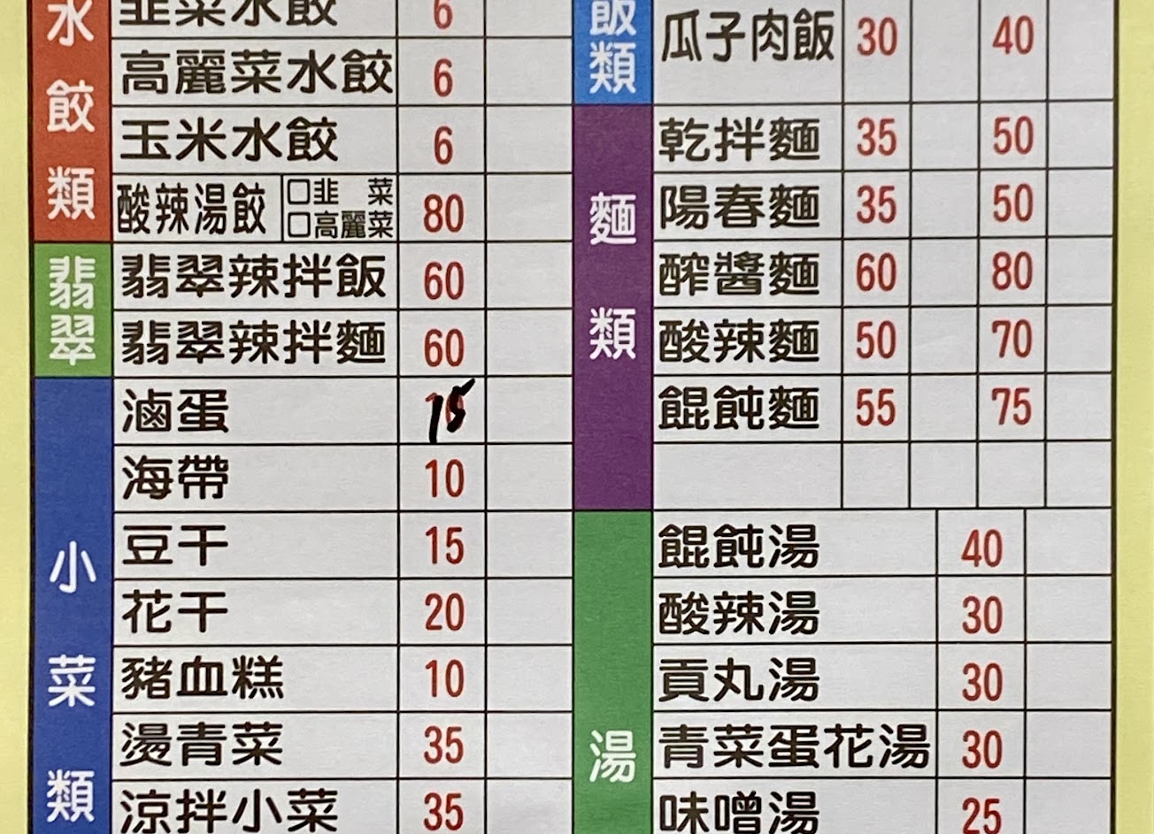 水餃有比一般大顆、皮厚,韭菜口味還行。酸辣湯偏酸,沒有很入味,整體口味普通但不會想再點。涼拌小菜和滷菜倒是不錯,蠻入味的。 店內有推出三種優惠套餐,水餃或麵加上小菜和酸辣湯的組合。