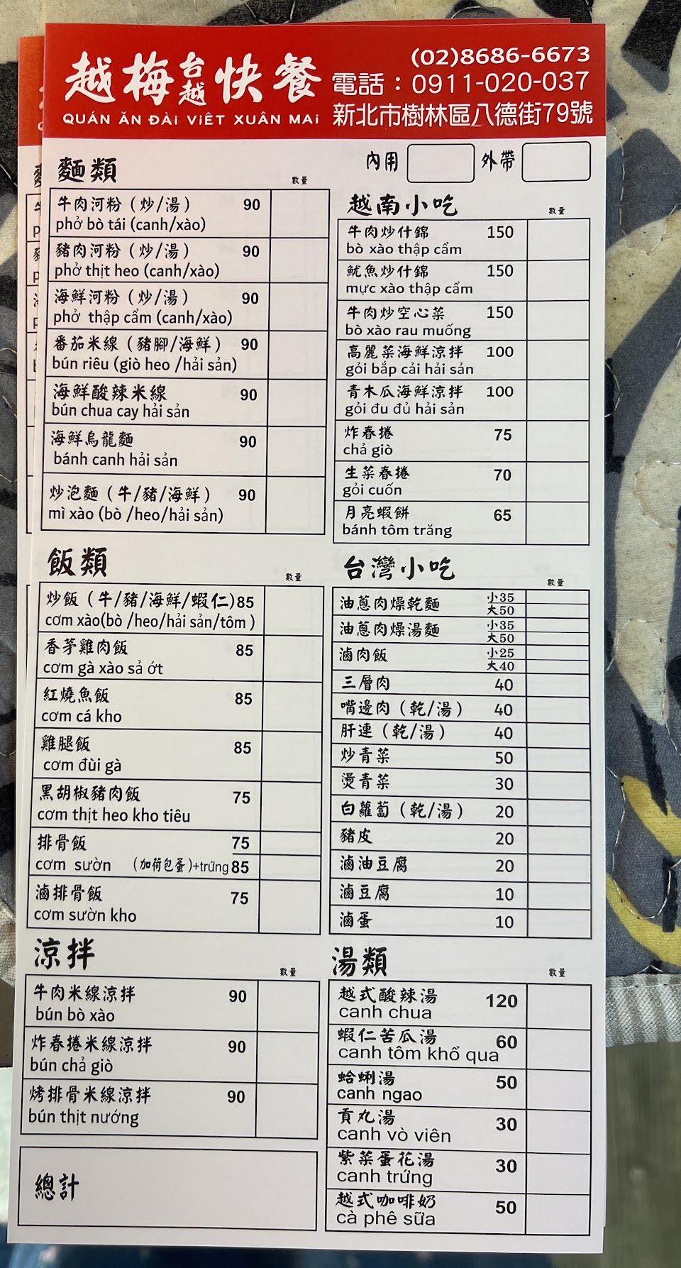 店內環境乾淨,價格非常合理。推薦越式炸春捲、涼拌米線,相當美味。單吃主餐不夠的話還有台式小菜(嘴邊肉、五花肉之類的)可以點,老闆娘也很客氣親切,會一直再訪!