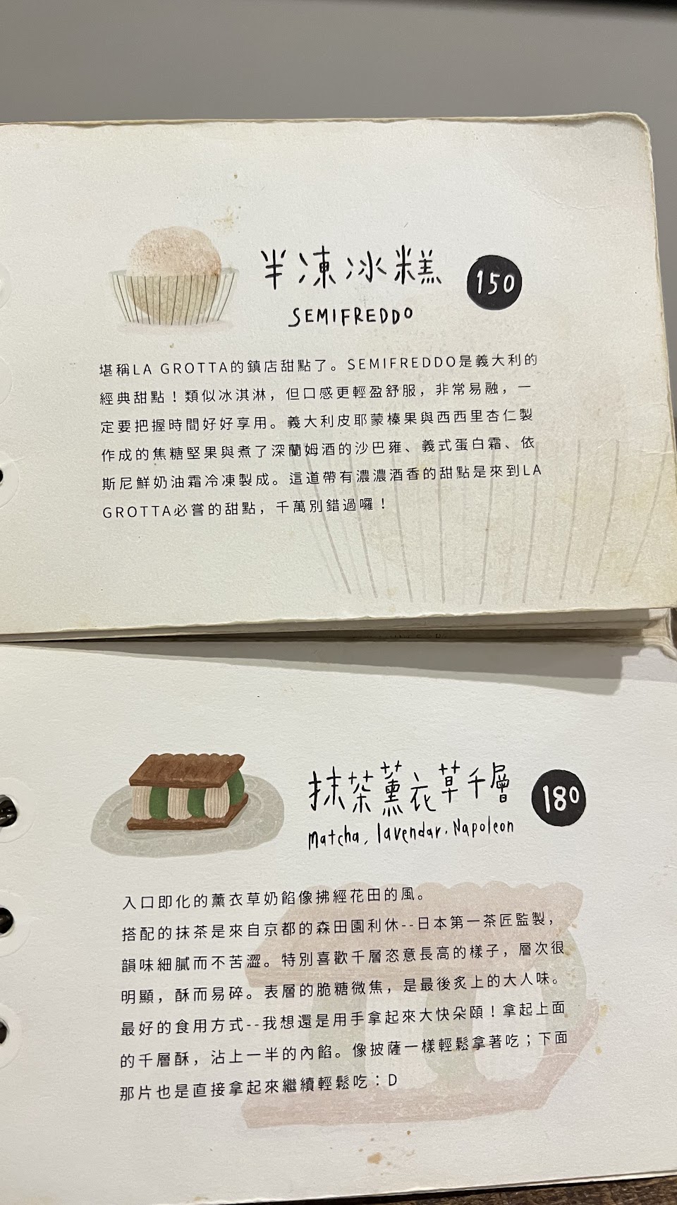 甜點頗負盛名的La Grotta , 店內幾乎一直是滿員狀態。三個甜點風格相近,輕盈口感,但飽和度其實拉得很高,仍不失順口,真的強。飲料部分較為一般,印象不深。