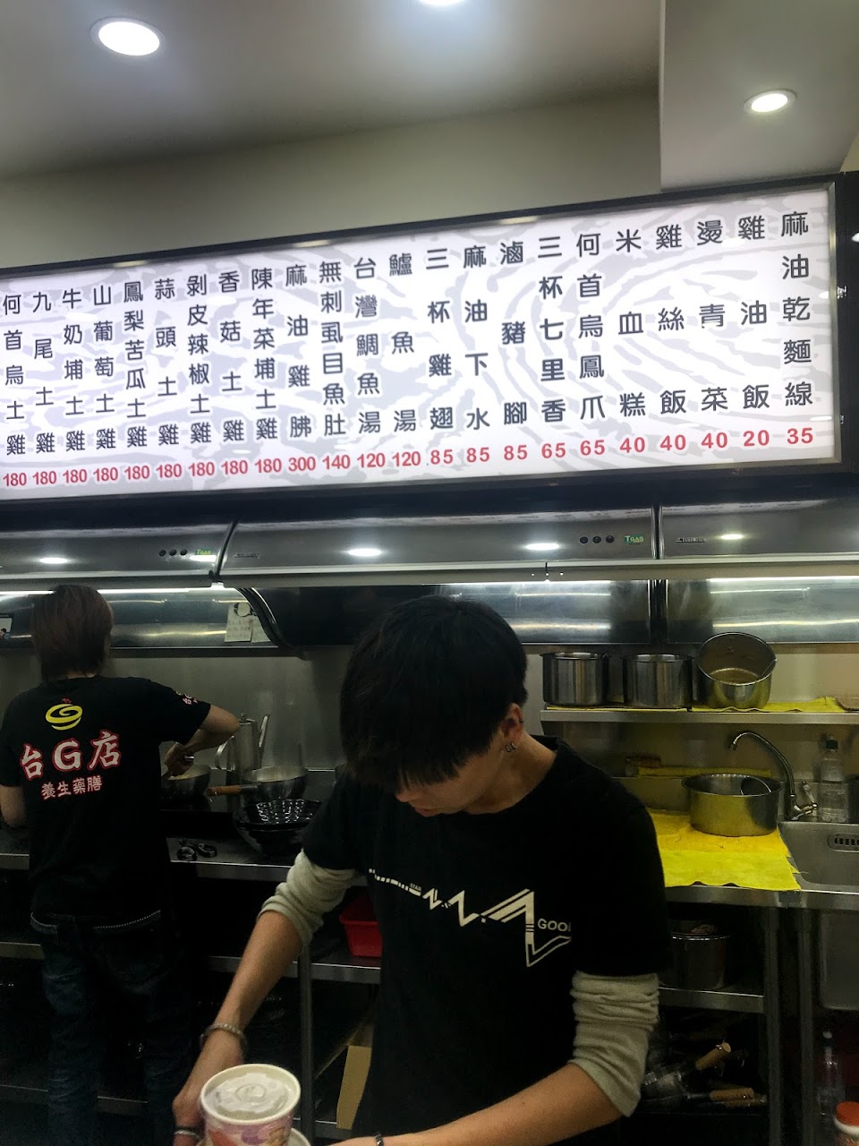 去過很多家台G店,這家店人不是很多,麻油雞湯上得很慢,說是因為現煮的關係。比較可惜的是薑歸薑,酒歸酒,雞歸雞,三者的味道沒有融合在一起。讓等了很久的我們有點失望。雞爪是微波爐回熱,讓表皮有點黏黏的感覺。青菜是高麗菜,量普普。以台G店應有的標準,這家讓我有點失望。但負責收盤的小弟弟手腳勤快,看到這樣奮發工作的孩子,星期天沒出去玩,而是在工作,很感動。天道酬勤,詳細他的辛苦不會白費。