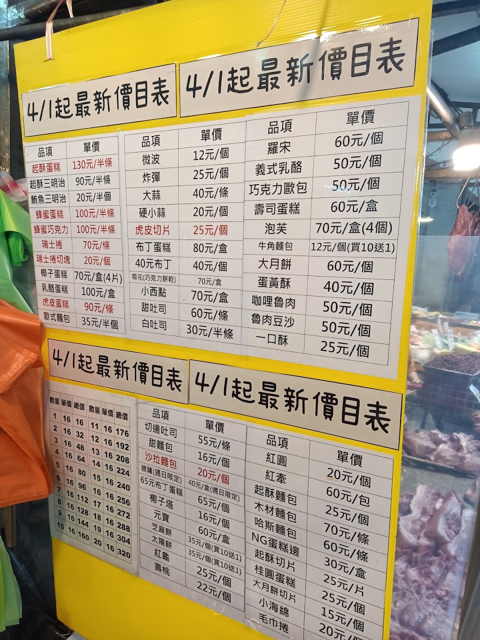 大部分麵包都$12 虎皮捲蛋糕也才$60 平價也不錯吃 阿姨也很親切 等我慢慢挑