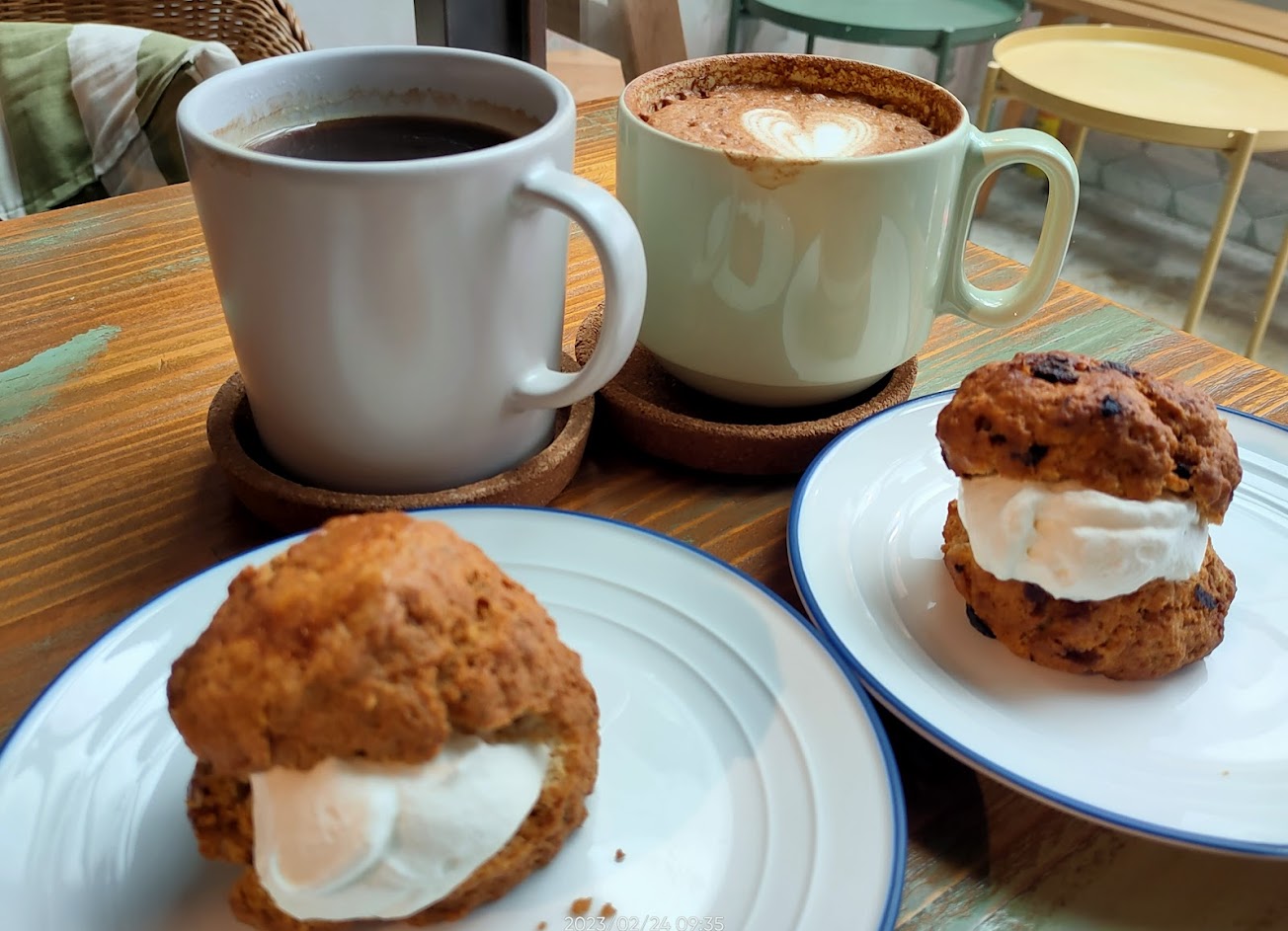 內用的司康會加熱,可以選擇要不要加鮮奶油,到下午三點多還有最後一批司康出爐,應該每一梯口味都不同。點了抹茶和咖啡拿鐵口味,味道都淡淡的不是特別濃郁,主要吃的應該是司康的口感,酥鬆不乾澀搭配微甜的鮮奶油很剛好。