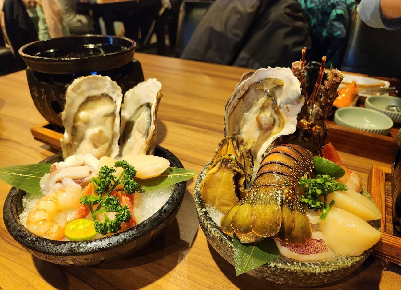 第一次來訪,因為威秀和旁邊店家都客滿…..只有這家老闆願意給予40~50分鐘用餐,因為下組客人也即將來到。雖然享受美食當下有點急迫,而今晚外場人手明顯不足,但是年輕老闆親切又客氣,出菜也很有順序,搭配促銷活動,龍蝦生蠔和干貝都很鮮甜,紐約客和牛小排板腱搭配店家的七味粉和玫瑰鹽實在很美味!配菜的高麗菜和醉蝦也好好吃?,東西看起來不多但吃的很飽!飲料有冷飲和咖啡,希望下次能喝到熱茶? …