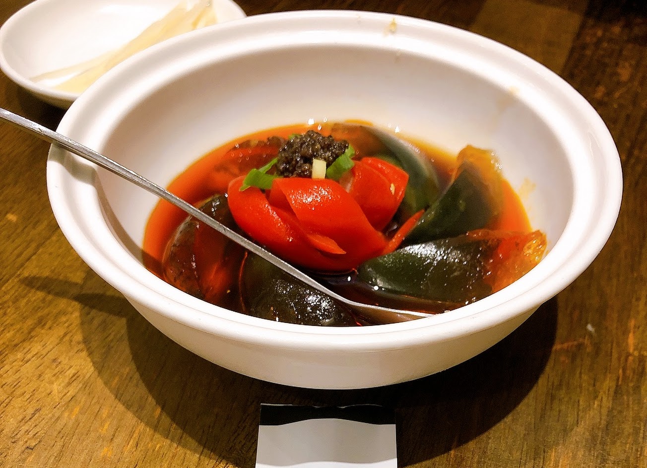 燒椒皮蛋,有別於市面上皮蛋的做法,皮蛋配上酸酸的醬汁,使人胃口大開。