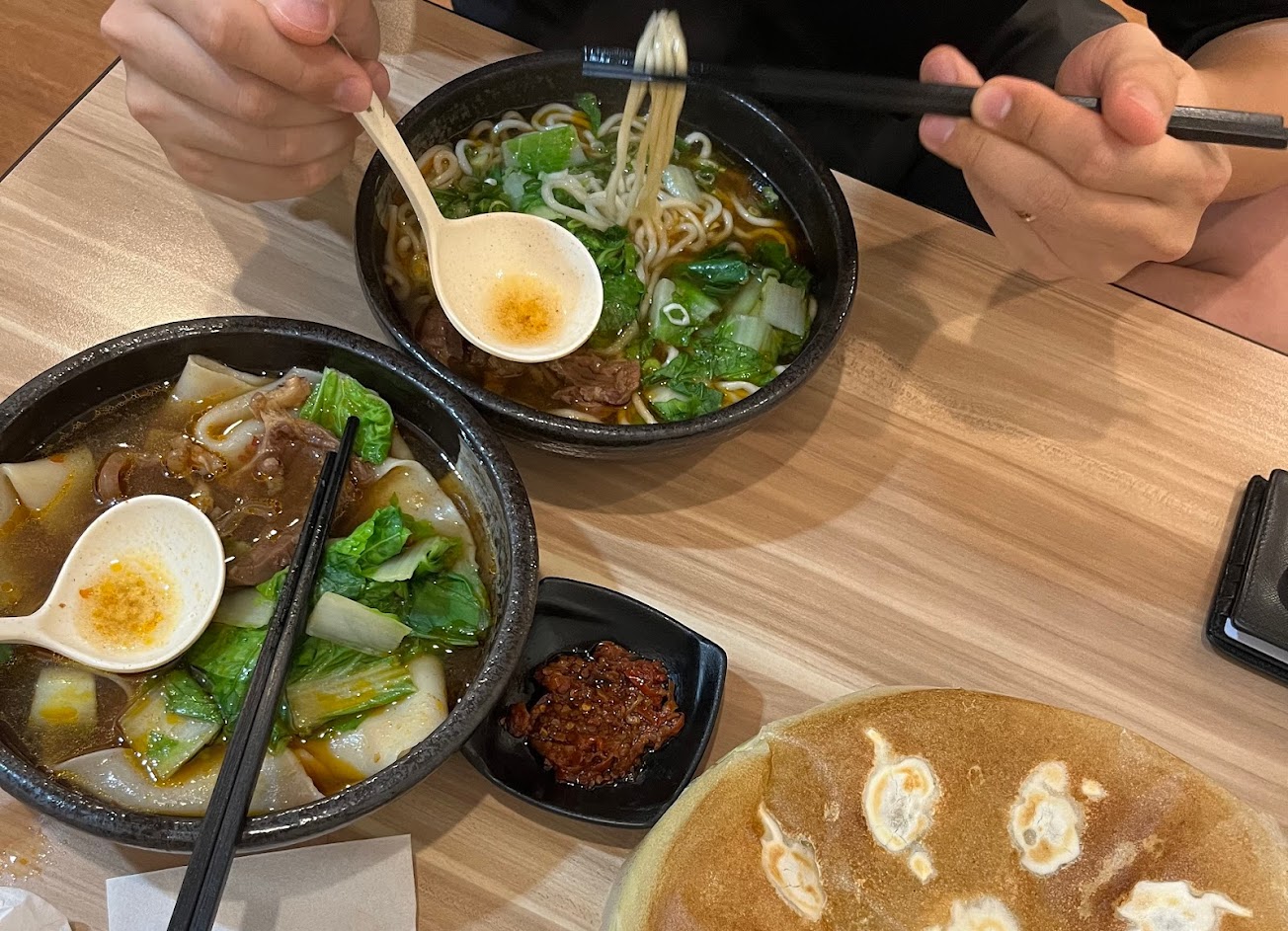 兩個人點一碗皮帶牛肉麵+一份鮮蝦煎餃就能吃的很飽了!滿滿的牛肉,煎餃上桌很訝異,跟看過的煎餃長的不一樣,而且豆花還免費使用,滿物超所值的。只是去用餐的時候酸菜沒了沒有補上,又看到洗乾淨的容器都攤在架子上,還以為店家準備休息了