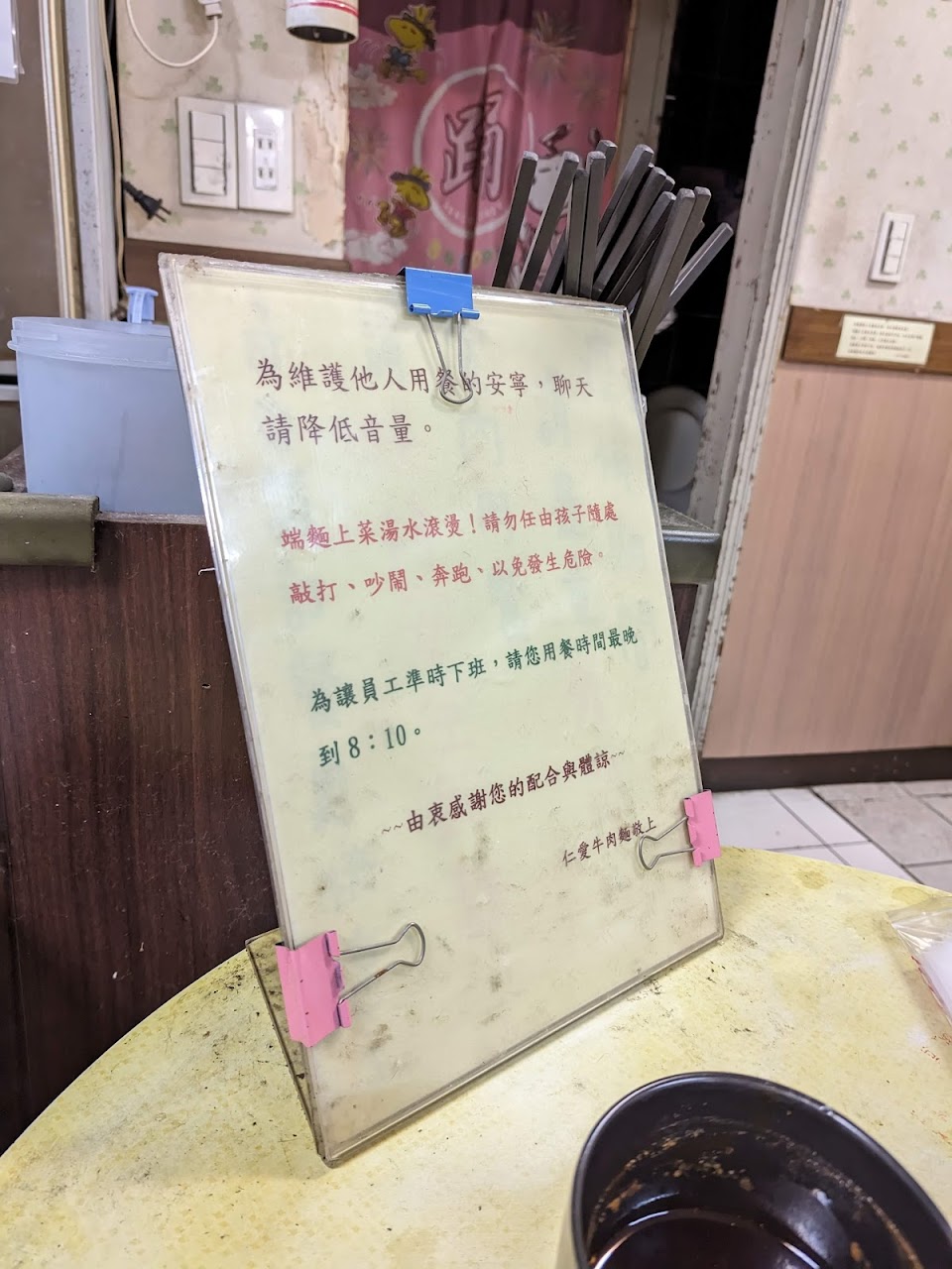 2021五月份再去又沒戴口罩了,可是現在國內疫情更嚴重,更應該注重防疫才對。 —— 經過發現店家現在都有戴口罩了!謝謝他們~ —— 小碗牛肉麵110元,肉是軟嫩的牛腱肉,湯頭清淡但香氣足,微辣。 內用皆使用環保餐具,碗應該是陶碗,湯匙和筷子看起來像是美耐皿。 座位寬敞,但因為有幾張圓桌,猜測人多時可能會需要併桌。 醬料和酸菜取用處稍小,人多時可能會擠在那裡。 想給五顆星,但實在無法接受防疫期間店員全部都沒戴口罩所以給一顆,希望店家可以重視防疫工作,讓消費者安心消費。
