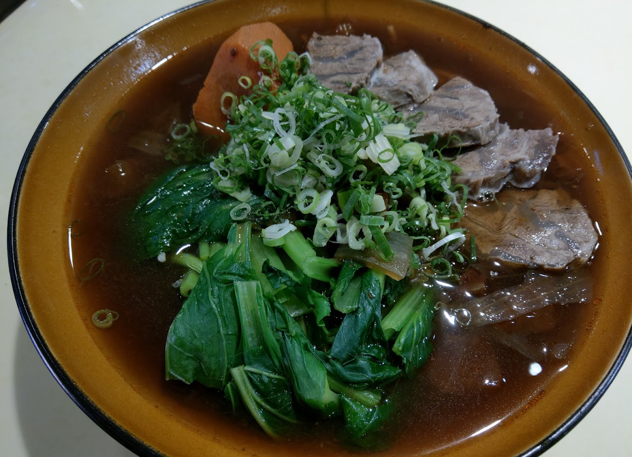 只是清燉牛肉麵吃起來像是 蔬菜精力湯麵(沒多少油, 確實可以喝出湯裡的蔬菜味, 也還不錯喝) + 牛肉. 跟一般的牛肉麵感覺不同.