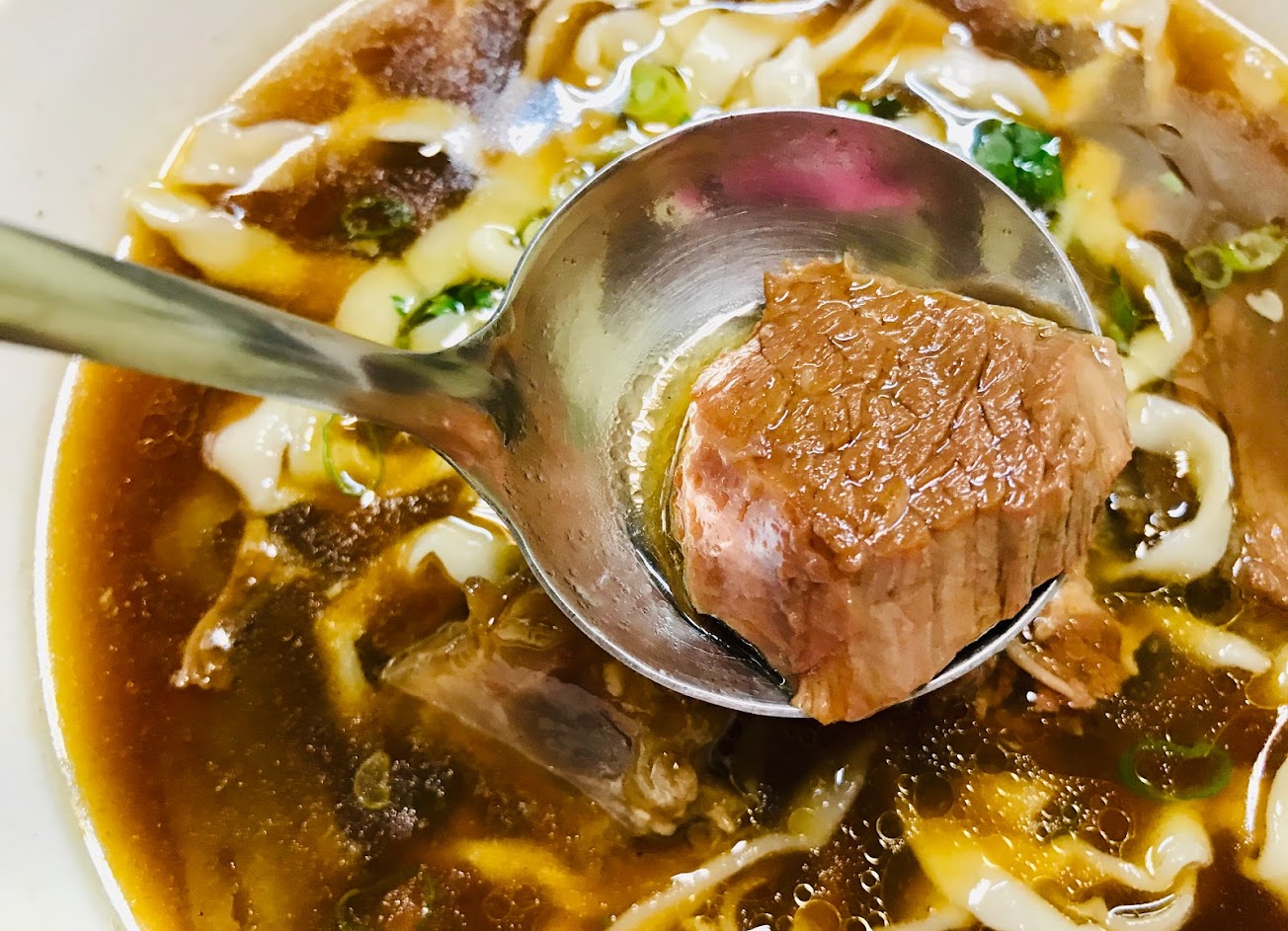 琥珀色的牛肉湯,不會因爲醬油而搶走了牛肉的香氣,證明是牛骨細火慢燉的原汁原味。,一口接著一口,濃醇香。?