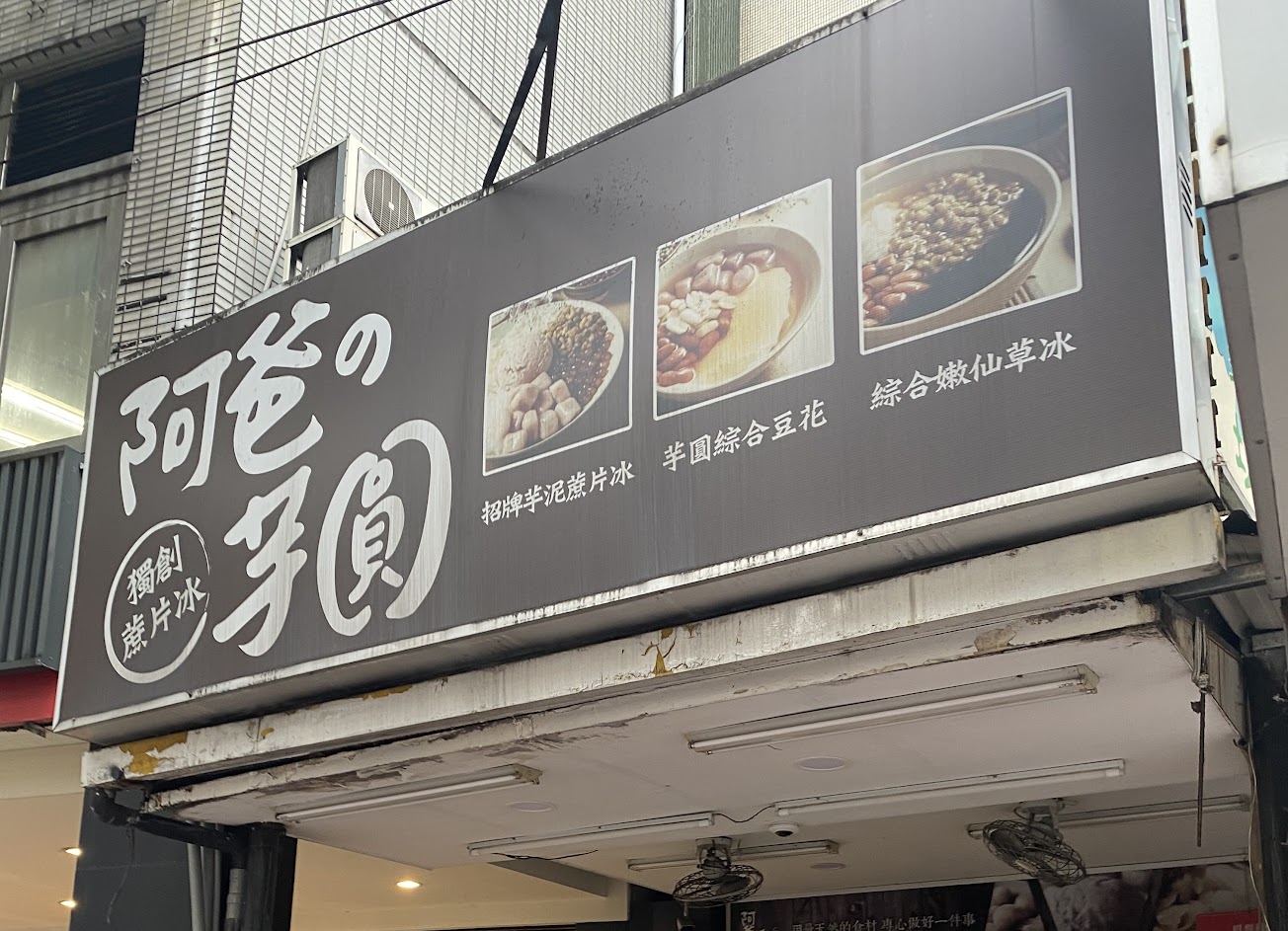 阿爸的冰店是近年來受到多方關注的知名冰店,最招牌的就是芋見泥綜合蔗片冰(現今的售價$135)內容有小芋泥球/芋泥/芋圓/白芋芋圓/粉圓/小薏仁,同時吃到非常多的冰品配料,大甲芋頭製成的(芋泥、芋圓、芋頭)三重享受,芋頭控應該都無法抵抗,黑糖蜜來製成故取名魚卵粉圓(真的蠻像的),最特別的蔗片冰以甘蔗汁製作並裁切出出片狀冰,讓人更無法不去點來吃吃,加上份量頗大兩個人吃也是剛剛好,還好不是假日來訪就不用在現場等候排隊的人龍。
