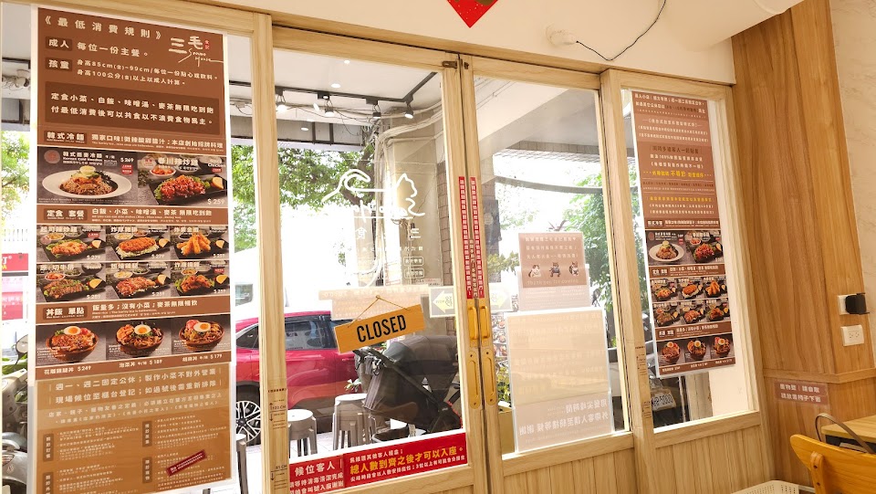「三毛食記」算是「韓式簡餐廳」,取名「三毛」,推測跟作家三毛應該是扯不上關係,因爲店裡掛了好幾幅三隻貓頭畫像,也有一些貓的擺飾,卻ㄧ直沒看到真貓出現,想想也知道,如果有美貓在現場,客人進來妳抱她摸,秩序就亂了!
