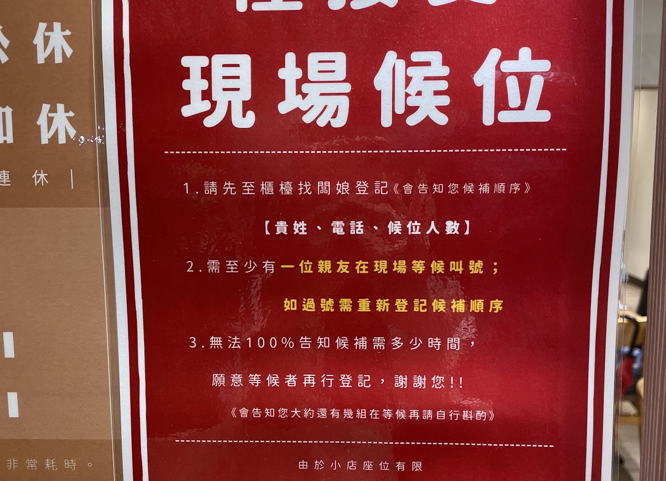 如果可以建議不要留手機,會造成不需現場等候的誤會,或是留了手機要加以提醒要在現場候位,避免造成不好的候位經驗唷