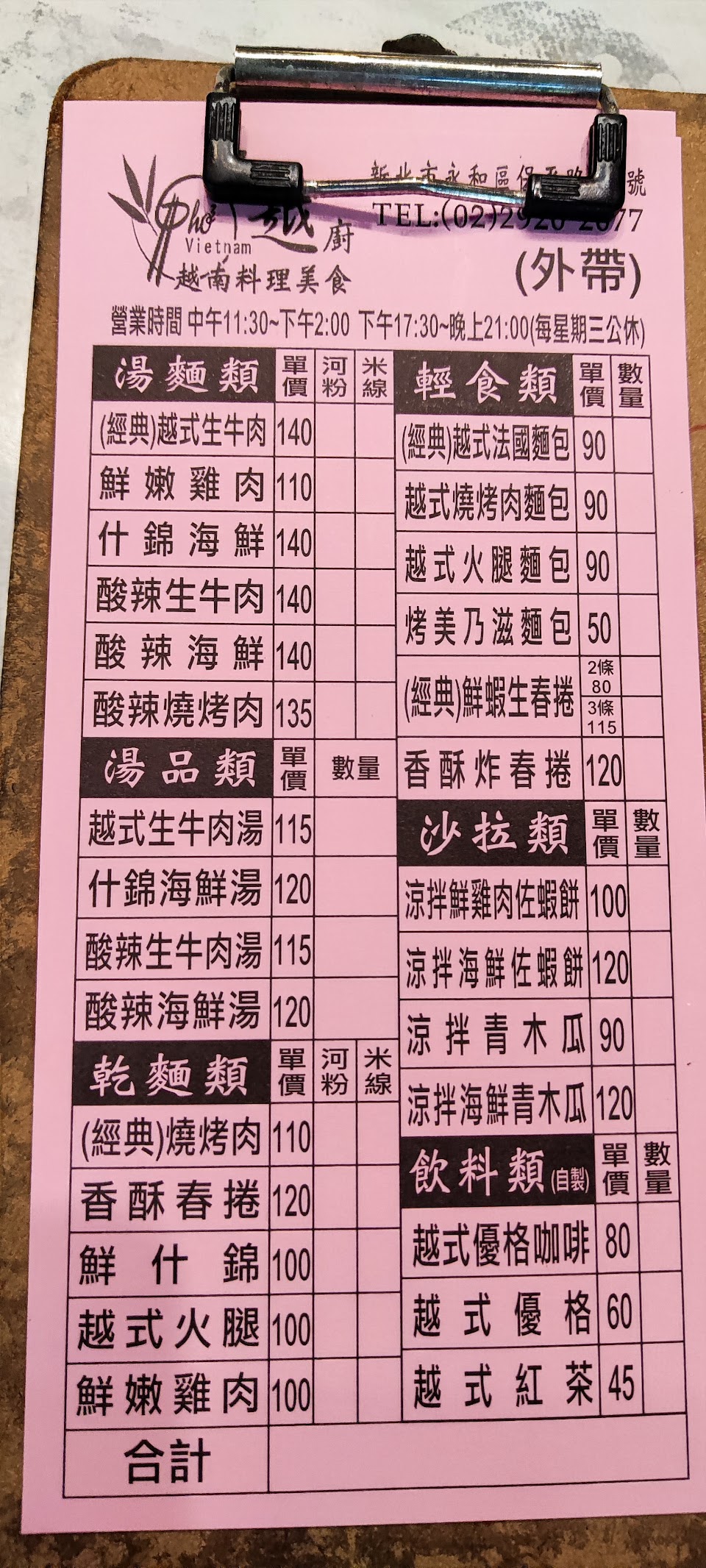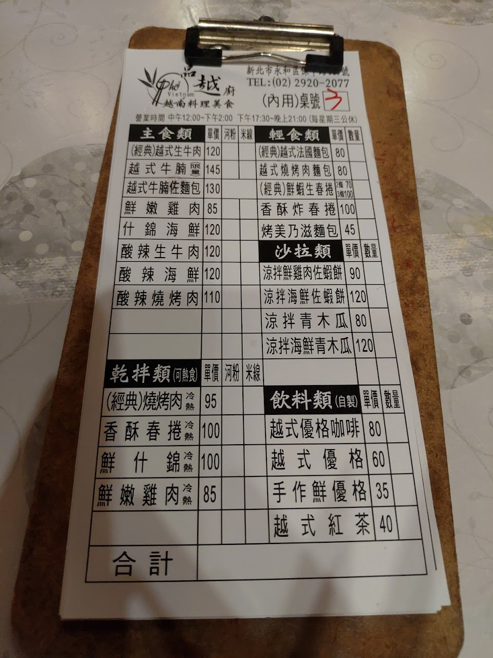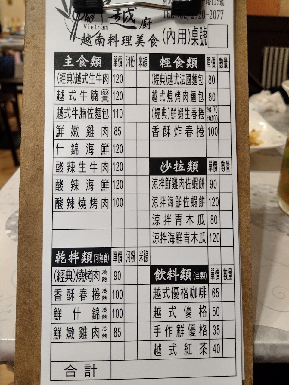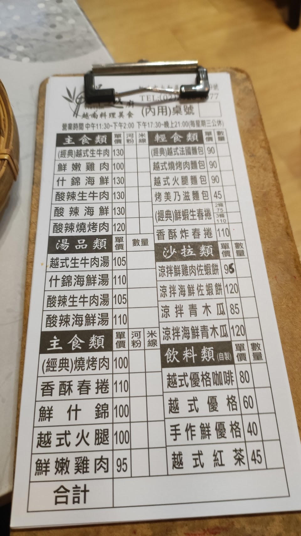 打電話訂餐買回家吃當晚餐,進門取餐時店家都會說你好,離開時會說再見,基本禮貌很好。店內第一印象是整潔舒適,有冷氣。餐點口味還行,涼拌烤肉米線不錯吃,生牛肉河粉家人覺得有點淡,涼拌青木瓜絲調味不錯,很脆,但絲偏粗,如果牙口不好可能就咬不動了。還沒試過其他菜,有機會想嘗試他們家的越南法國麵包。