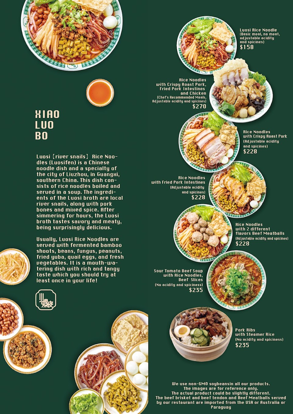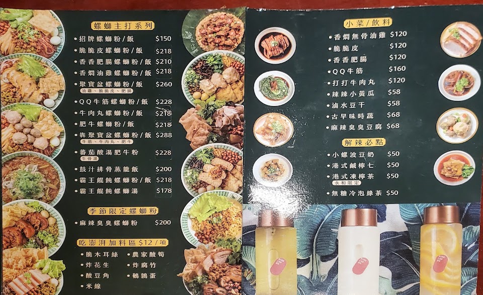 招牌螺獅粉、豉汁排骨蒸籠飯、小螺波乾麵、滷水豆乾、香悶無骨油雞、小螺波豆奶