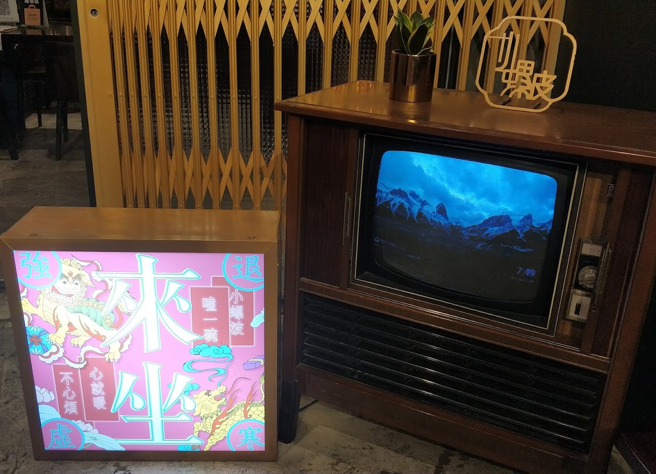 這次是平日中午來吃,人有點多,在門外一邊等一邊拍復古風的裝置,復古的電視箱裡,裝的真的是舊型「電視機」呢!